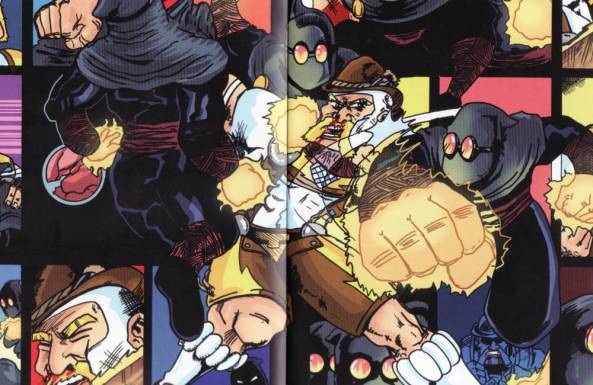 Optisch gibt es wenig auszusetzen. Chris Stil ist markant und passt einfach ideal zu seinem Helden. Leichte Steigerungen zur ersten Ausgabe sind ebenfalls sichtbar. Als kleiner Gag am Rande beginnt auch diese dritte Ausgabe mit einer Shot auf den Helden, so wie es bei den Superheldencomics der 60er bis 80er Jahre Tradition war. Auch sonst spielt Chris mit Traditionen und kleineren Easter Eggs. Der neue Freund hat gewisse charakterliche Ähnlichkeiten mit einer bekannten Marvel-Figur, indem sie die sogenannte Vierte Wand durchbricht und Elemente des Comics auf ihn wirken und er mit ihnen interagieren kann. Auch gibt es eine schöne Seite, auf dessen Vorderseite diese Figur mit gespiegeltem Text spricht und sobald man umblättert hat er genau die gleiche Pose, wie auf der Vorderseite und der Text ist nicht mehr gespiegelt. Hält man nun noch die Seite gegen das Licht, so sitzen die Sprechblasen fast millimetergenau übereinander, was ich persönlich sehr witzig finde. Überhaupt hat diese Ausgabe viele Geheimnisse, die es zu entdecken gilt und selbst mir als altem Hasen ist sicherlich nicht alles aufgefallen.
