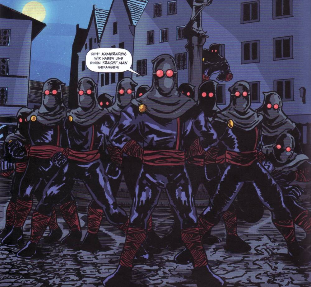 Nachdem es Tracht Man bereits mit dem Saupreussen zu tun bekommen hat und sich auch schon mit dem Nepomuckl herumschlagen musste, ist nun eine mysteriöse Organisation an der Reihe, die dem verstorbenen König Ludwig dem II. huldigen. Und so wie es Chris hier anstellt, scheint diese Organisation schon ein deutlich schwerer Brocken zu sein, als die bisherigen Gegner Tracht Mans. Aber mit dem bisherigen Schurkengenie scheinen sie dennoch nicht zusammenzugehören. Alles ein bisschen geheimnisvoll und was die neue Heldin Bavariana betrifft, gibt es auch noch nicht so viel Neues zu berichten. Wie es aussieht, versucht Chris nun dem bayrischen Helden eine neue Richtung zu geben und dies schafft man am besten mit einem passenden Gegenpart zum Helden und eventuell einem Freund. Natürlich kann ich hier nur mutmaßen, ob Chris absichtlich typische Klischees für seinen Helden nutzt, denn immerhin sind die bisherigen Ausgaben bereits mit einigen Anspielungen der klassischen US-Superhelden gespickt.
