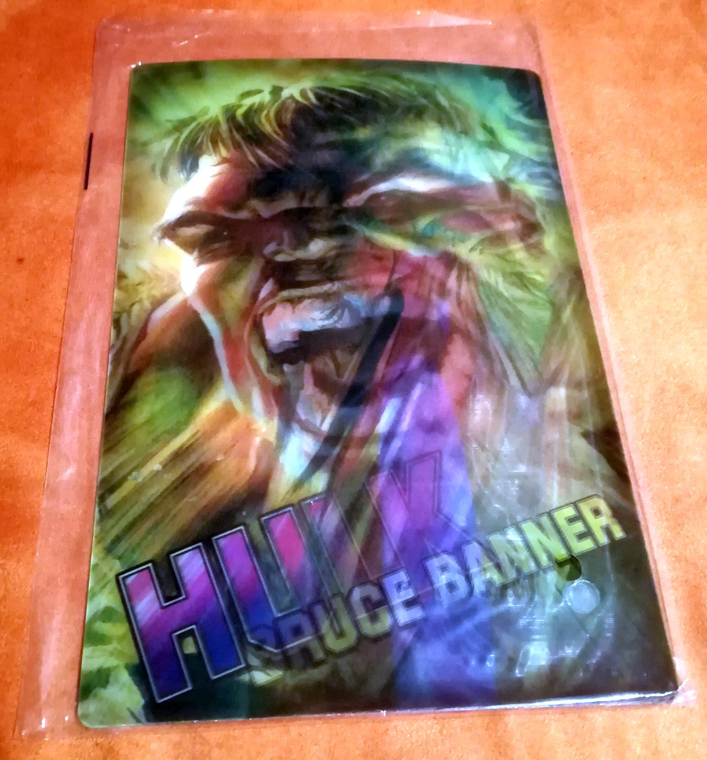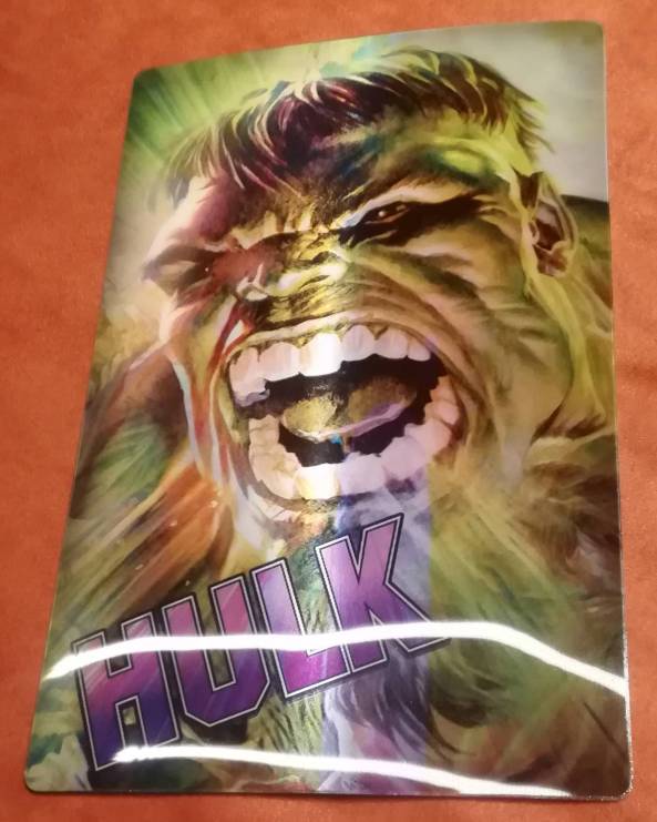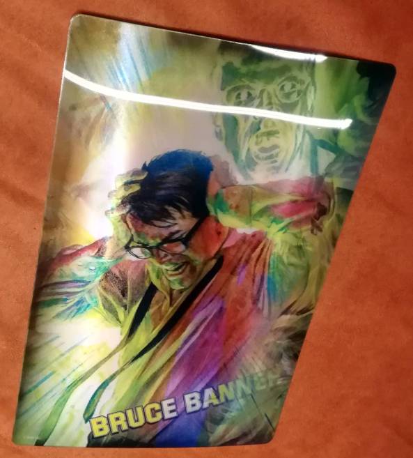 Unter dem Ghostbusters-Backpack kommt eine Art Schild zum Vorschein. Eine ca. A5 großes Hologrammbild auf dicker Pappe mit einem Wechselmotiv zu Hulk und Bruce Banner von Alex Ross. Als Grundlage dient hierbei das Covermotiv zu Savage Hulk Nummer 1 von Alex Ross zum 75. Marvel-Jubiläum. Das Mini-Hologramposter ist leicht gewölbt und sehr stabil. Der 3D-Effekt kommt auch sehr gut zur Geltung, allerdings muss auch das Licht passen, da sonst alles irgendwie ineinander verschwimmt.