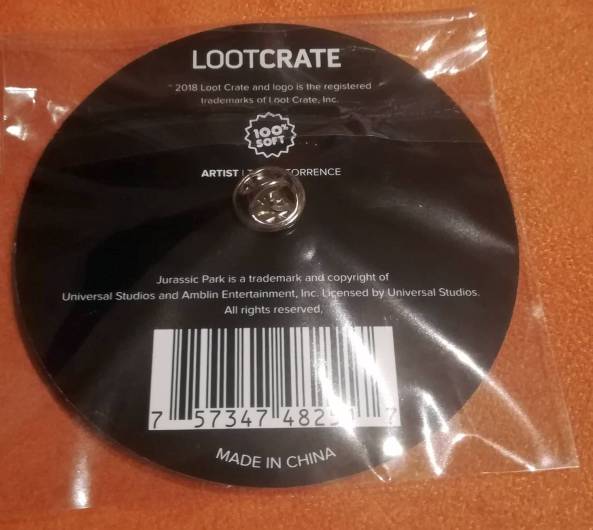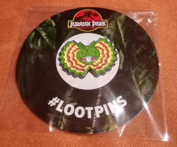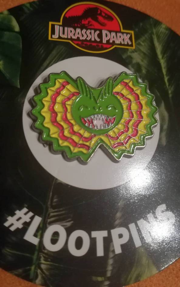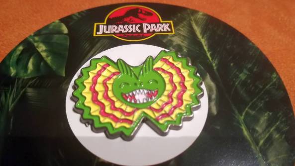 Wie immer darf auch der Pin nicht fehlen. Passend zum Hauptfranchise das diesmal mit drei „Beiträgen“ dabei ist, wenn man den Pin dazu zählt, ist es ein Dilophosaurier mit aufgefalteter Halskrause, der bedrohlich dem vermeintlichen gegenüber Säure ins Gesicht spucken möchte. Mit nur 3x2cm ist er allerdings etwas kleiner, als die bisherigen Pins, dafür ist er wesentlich farbenfreudiger. Aber ich muss gestehen, dass dieser kleine Pin, genauso wie ein späteres Gadget, so einige alte Erinnerungen hervorruft.
