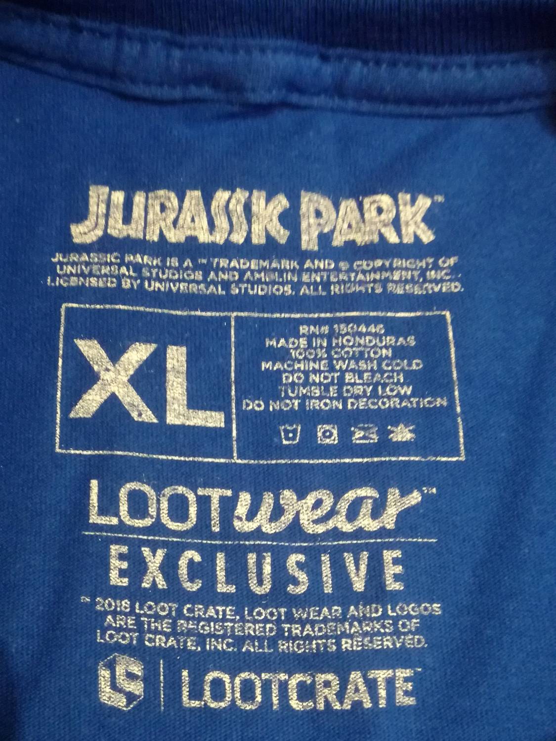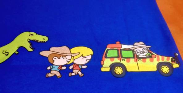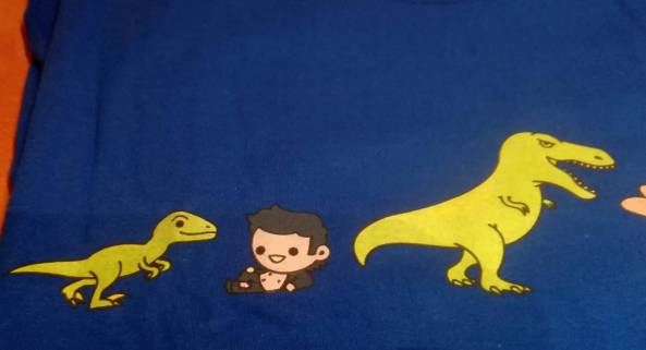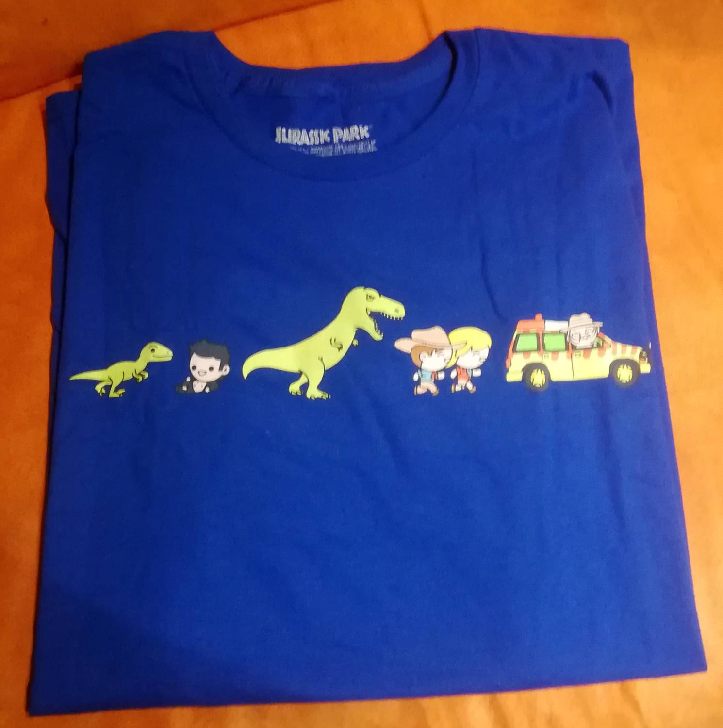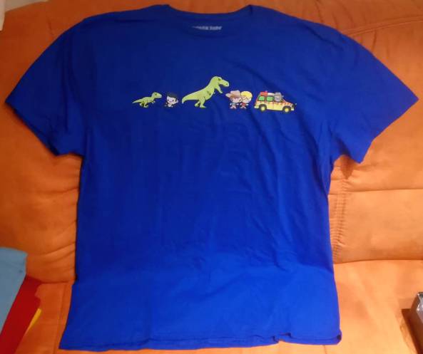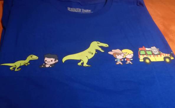 Den Anfang macht ein leuchtend blaues T-Shirt mit einem „Jurassic Park“-Aufdruck. Zu sehen sind Dr. Ian Malcolm, der verletzt am Boden liegt, Dr. Alan Grant zusammen mit Ellie Sattler und im Jeep ist John Hammond zu sehen, die alle wiederum vor ein paar Dinosauriern flüchten. Und zwar einem Velociraptor und einem Tyrannosaurus Rex. Der Stil ist eher niedlich gehalten, was dem Humor zuträglich ist. Weniger ist offenbar mehr, hat sich der Designer hier gedacht und alles auf einer imaginären Linie platziert.