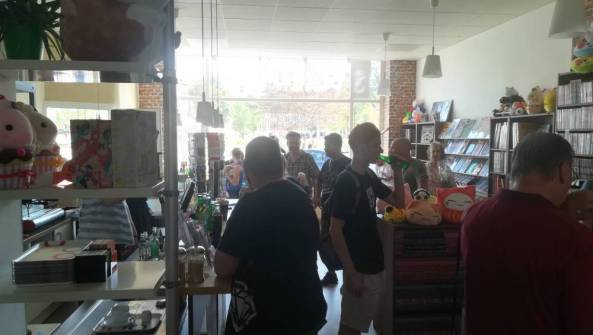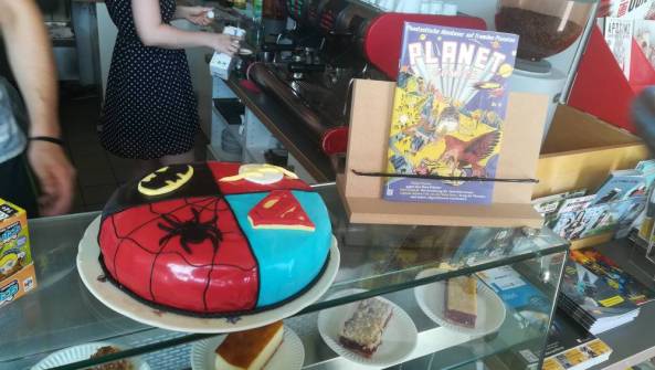Ich schaue auf die Uhr, kurz vor 10 Uhr und beschließe vor dem Laden zu testen, ob ein Live-Video mit der vorhandenen Bandbreite funktioniert. Also Facebook angeworfen, zur Blog-Facebook-Seite gewechselt und einen ersten kurzen Test online geschickt. Danach wieder rein, weil die Eröffnungsrede anstand. Mit einem leichten Lächeln aller beteiligten ging es nach Eds Rede weiter. Das erste Geschenk, eine wunderschöne Comic-Superheldentorte wurde überreicht. Etwas DC-lastig zwar, aber sehr gelungen schmückte sie schon kurz danach die Kuchentheke des kleinen Cafés. Die ersten Bestellungen gehen an der Theke ein und wir schlendern ein wenig durch den „Laden“. Allzu viel Zeit hatten wir aber nicht, denn dies war eine Eröffnung und ich wollte gerne ein Interview mit Ed machen. Denn so ganz umsonst sollte die Fahrt nicht sein, weder für mich, noch für Ed. Also haben wir es uns gegenüber vom Café gemütlich gemacht und ein Live-Interview gestartet, welches ihr nun auch auf Youtube findet, für alle, die nicht auf Facebook unterwegs sind, oder bisher meiner Blog-Facebook-Seite noch nicht folgen.