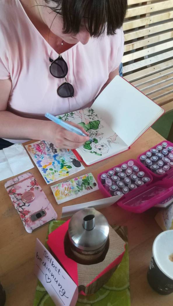 Das Café füllt sich weiter, immer mehr Gäste genießen die gemütliche Atmosphäre und man kommt mit einigen ins Gespräch. In der Leseecke sitzt eine junge Dame, die ein Mädchen im Mangastil in ihr Zeichenbuch malt. Ich spreche sie an, wir unterhalten uns, meine Tochter stimmt mit ins Gespräch ein. So schnell findet man Kontakt und es ist sehr angenehm. Fröhliche und freundliche Menschen unterhalten sich, stöbern in den regalen, trinken Kaffee und essen Kuchen. Wem es in dem kleinen Geschäft zu eng wird, der sucht sich kurzzeitig Platz auf der gegenüberliegenden Seite des Cafés, wo ein paar Sonnenschirme und Stühle und Tische aufgestellt sind. Auch dieses Gebiet gehört zum Café. Wer möchte, so wie meine beiden Kinder auch, kann auch gerne auf den wunderbaren Hirschplatz, ein direkt angeschlossner Stadtpark mit Spielplatz gehen, wo sich die Kinder austoben können, während die Eltern gemütlich unter den Sonnenschirmen sitzen, Kaffee trinken und Kuchen essen.