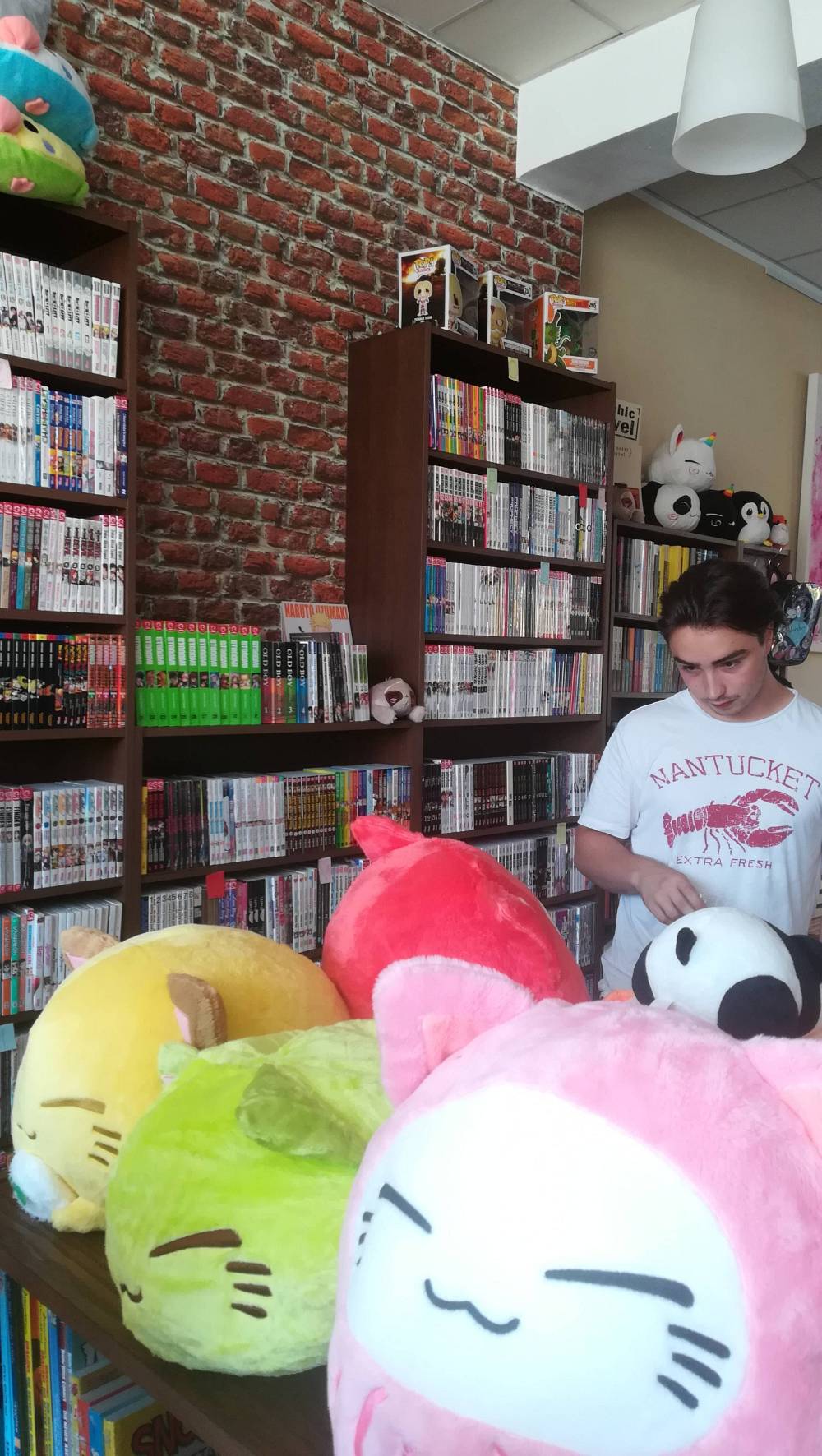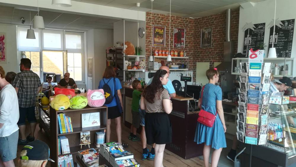 Ein erstes Programmhighlight fährt gerade während des Interviews vor. Ein Transporter mit der Aufschrift „Stark Industries“ und Ed verspricht ein tolles Programm. Doch schaffen wir das noch. Ich hatte unser ganzes Kleingeld in die Parkuhr gepackt und auch meine Kinder wollten lieber in den Garten und in den Pool. Bei der Wärme auch verständlich. Gut, eine knappe dreiviertel Stunde hatten wir noch. Also wieder ins Café und noch ein bisschen umgeschaut. Comics von verschiedenen Deutschen Verlagen sind ordentlich sortiert in den Regalen. Panini, Splitter, Carlsen, Mosaik Verlag, Tokyopop, Kazé, Weissblech Comics und sogar NiGuNeGu von Pyramond liegt aus. Die Manga sind sogar fein säuberlich nach Alphabet sortiert.