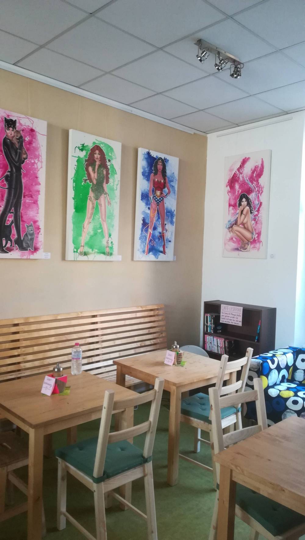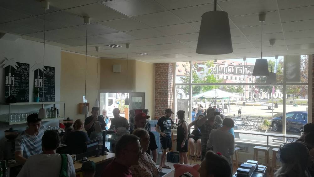 Zuerst einmal haben wir uns die Location etwas genauer angesehen und ich habe gleich mal geprüft und nachgesehen, wo und wie man eventuell ein Live-Video via Facebook-Seite starten könnte, als Ed auch schon aus der Tür trat und uns willkommen geheißen hat. Also rein in das Café und ja, es ist sehr gemütlich und noch reichlich Platz gewesen. Eine schöne Theke mit Kuchen lachte uns entgegen, dahinter diverse Automaten für verschiedene Kaffeespezialitäten. Auf der gegenüberliegenden Seite Regale mit verschiedensten Comics und Manga. Das Konzept scheint klar. Comicshop meets Café und mein Gefühl sagt mir, dass es aufgehen könnte. Am Ende der langen Regalseite wartet eine gemütliche Sitzecke mit Sofa, Bank, Tischen und Stühlen und lädt mit einem kleinen Regal, welches extra mit Leseexemplaren bestückt ist, zum schmökern und verweilen ein.