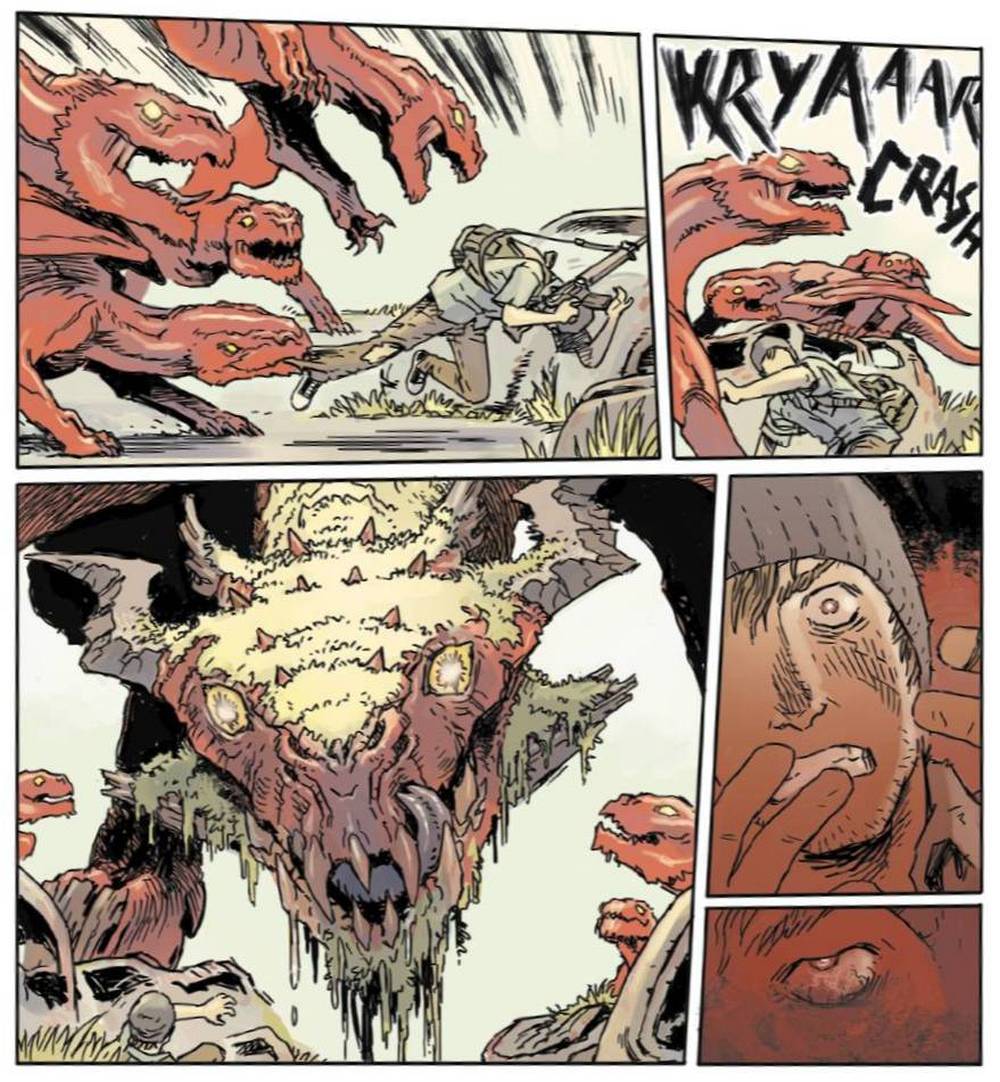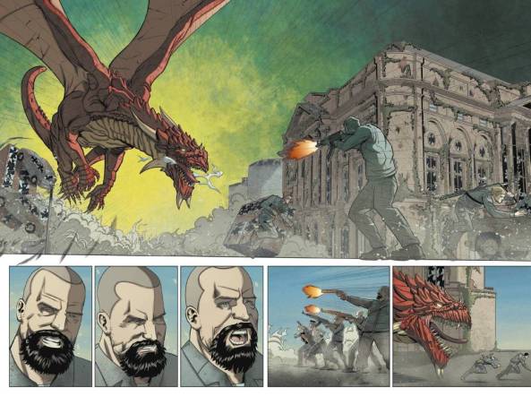 Sein Artwork ist etwas Besonderes. Klare Linien und dennoch ein unglaublicher Detailreichtum. Die verlorenen Plätze, wie beispielsweise London, gleich zu Beginn des Bandes, wirken dennoch echt und real, als hätte man sie einfach nur von einem Foto oder dem realen Leben abgezeichnet. Grundsätzlich wirkt Zinnober sehr visuell und cineastisch. Die monumentalen Drachen, die Landschaften und auch die Menschen, die mehr als nur schmückendes Beiwerk sind, erwecken die Szenen zum Leben und man merkt, wie Singh mit dem Blickwinkel, der Kamera, spielt. Da gibt es die große Totale, als ein Drachen auftaucht, dann der Umschnitt zu einem der Anführer, direkt auf sein Gesicht, als er seine Befehle brüllt. Als Nächstes die Truppen, bewaffnet, nervös und angespannt und die ganze Zeit fragt man sich: „Was macht der Drache gerade?“, als die Frage auch schon im nächsten Panel beantwortet wird, indem der Kopf des Drachen zu sehen ist, der gerade versucht einige der Männer zu erwischen. All das auf nur einer Doppelseite.