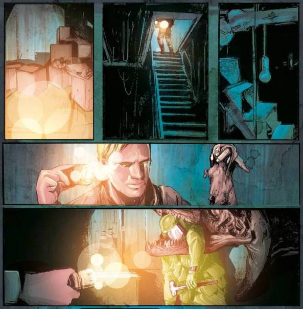 Auch gute Zeichnungen sind nichts wert, wenn es nicht den passenden Inker und Koloristen gibt. Diese Aufgaben übernehmen Cristian Docolomansky als Inker und Ilaria Fella zusammen mit Nic Chapuis als Koloristen. Im Anhang erklärt Ralf Singh, dass er zuerst etwas zögerte, Cristian als Inker zu akzeptieren, weil dieser aus seinen Vorzeichnungen oftmals etwas anderes machte, als er es sich selbst vorstellte. Dem kann ich auch zustimmen, denn bereits sehr früh sind Thorsten und Ralf über Facebook mit ihrem Projekt an die Öffentlichkeit gegangen und haben viele Menschen am Entstehungsprozess teilhaben lassen. Und hier sieht man bei einigen Zeichnungen, was Ralf meint. ABER, und das meine ich sehr positiv, wirken seine Grundzeichnungen durch Cristians Arbeit noch besser, weil eben dieser kleine Unterschied in der Interpretation des Artworks vorhanden ist. Cristian erweitert Ralfs Vorzeichnungen um so viele Aspekte. Und ähnlich verhält es sich mit der Farbgebung. Sowohl Ilaria Fella, als auch Nic Chapuis bringen zusätzliches Leben in die Bilder. Und obwohl jeder über einen sichtbaren eigenen Stil verfügt, fällt es kaum auf, dass ab dem dritten Kapitel statt Ilaria Nic für die Farbgebung verantwortlich ist.