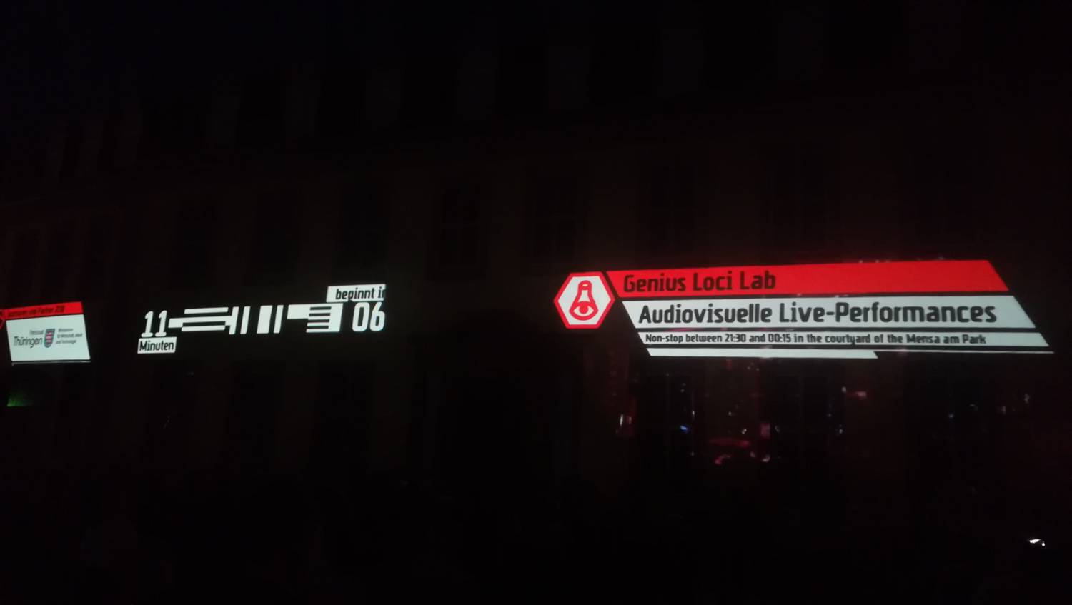 Das diesjährige Genius Loci LAB fand an der Mensa im Park statt. Letztes Jahr war die Location der Theaterplatz mitsamt Nationaltheater und Bauhaus-Museum. Doch dieses Jahr diente der Innenhof der Mensa am Park auf dem erweiterten Campus der Bauhaus-Universität internationalen Künstlern als Leinwand für ihre Fassadenprojektionen und Live-Shows mit illuminierter Bürobrücke und vielem mehr.