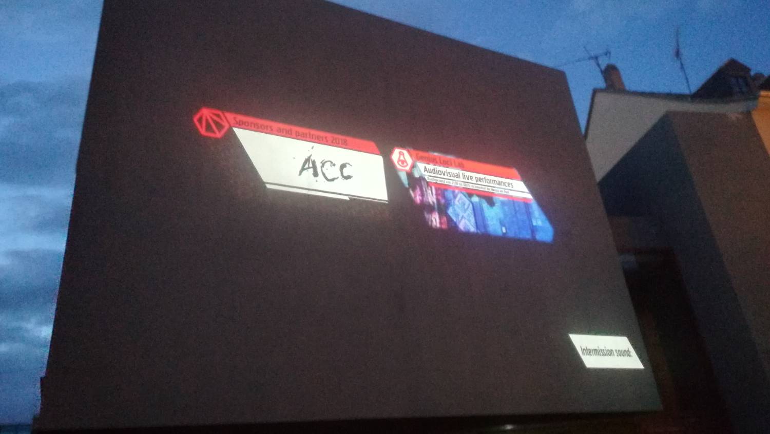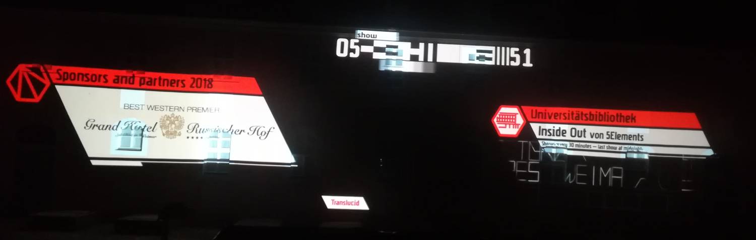 Nun möchte ich natürlich noch die drei Hauptinstallationen vorstellen. Beginnend mit der Fassadenprojektion an der Bauahaus-Universitätsbibliothek. Das 5-köpfige Künstler-Kollektiv aus Bremen versucht mit ihrem Projekt „Inside Out“ eine permanente Medieninstallation zu etablieren, indem Informationen der Nutzer der Bibliothek nach außen getragen werden. Hierfür analysiert ein Algorithmus die Suchergebnisse der Nutzer und generiert daraus Informationen, die auf die Fassade projiziert werden.
