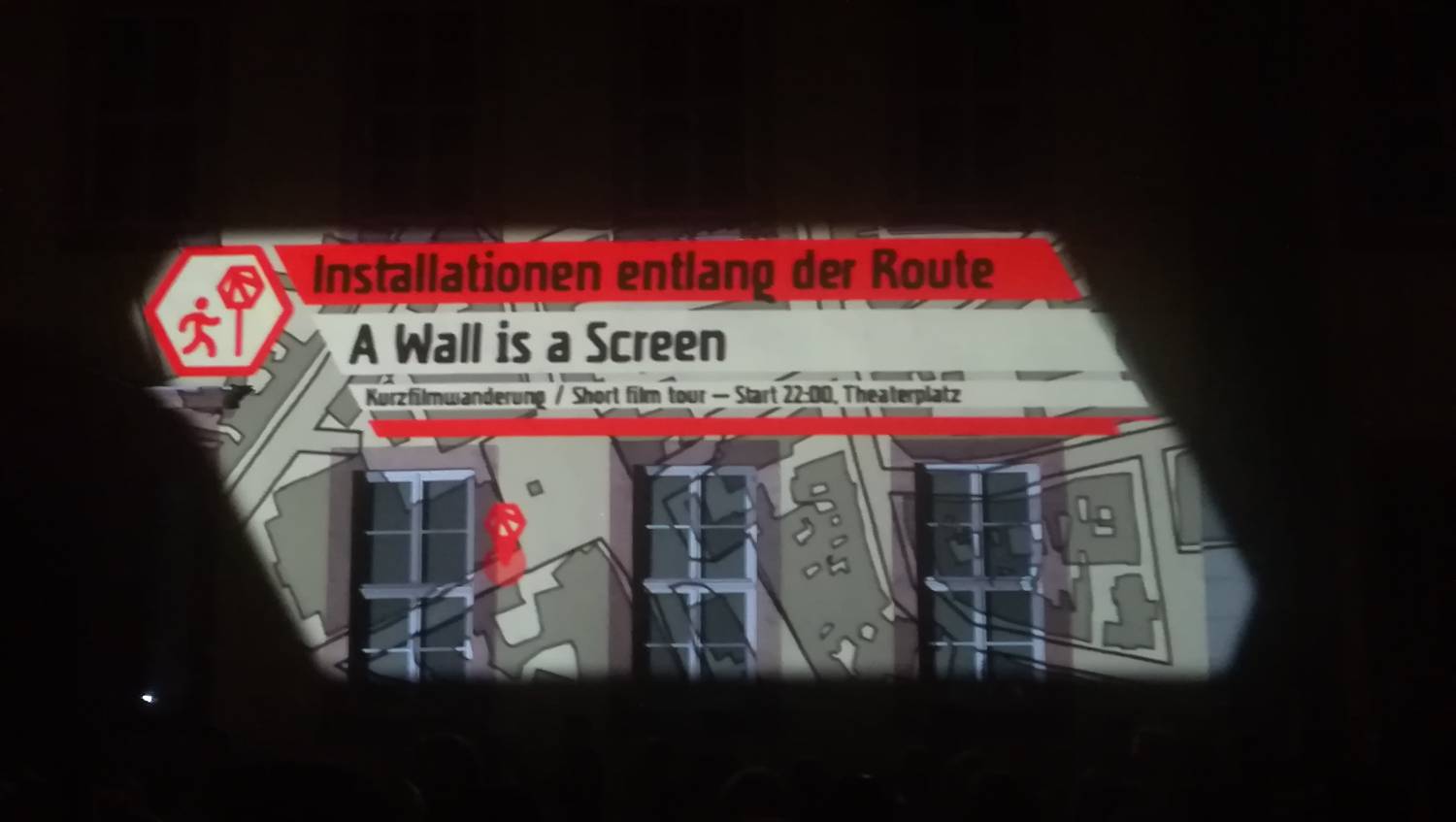 Beim diesjährigen Genius Loci sollten Wände nicht nur sprechen. Es gab auch das Projekt „A Wall is A Screen“, bei dem eine Gruppe von Menschen durch die Stadt lief, ähnlich einer Stadtführung, durch die Innenstadt wanderte und Halt an geeigneten Projektionsorten machten, um dort Kurzfilme zu zeigen. Ist ein Film zu Ende ging die Wanderung weiter, zum nächsten geeigneten Ort. Der Treffpunkt war die linke Seite des Deutschen Nationaltheaters am Theaterplatz. Freitag um Samstag ging es dann ab 22:00 Uhr je zwei Stunden auf Tour.