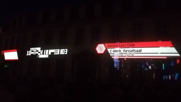 Doch genug der allgemeinen Infos. Was gab es dieses Jahr alles zu sehen? Die drei Videomapping-Shows werde ich etwas detaillierter vorstellen, aber das ist natürlich nicht alles gewesen. Es gab, wie auch schon in den letzten Jahren, eine Festivalroute, die interessierte Besucher an alle Schauplätze führte. Nunja, fast alle. Denn einer der Schauplätze, das E-Werk, liegt etwas weiter ab, von der Route. Hier fanden das AV-Live-Kino (am Freitag und Samstag, jeweils ab 22:00 Uhr), der Genius Loci Club (Freitag und Samstag, jeweils ab 23:00 Uhr) und der Genius Loci Talk (Samstag ab 13:00 Uhr, nur nach Voranmeldung) statt. Die jeweiligen Locations waren das Lichthauskino, sowie der Kesselsaal E-Werk. Da ich an dieser Location jedoch nicht vertreten war, kann ich jhier auch keine Bilder und weiterführende Infos liefern.