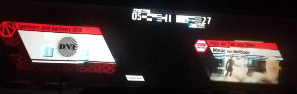 Die letzte Hautattraktion fand am Haus der Frau von Stein, ebenfalls nur wenige Laufminuten vom Goethehaus entfernt, statt. Hier vereinten das junge Studio MultiScalar die Historie des Ortes, zusammen mit seiner an eine Theaterbühne erinnernde Architektur, um mit Simulation, Animation und Abstraktionen den Dialog der „Muse und Genie“ zu inszenieren.