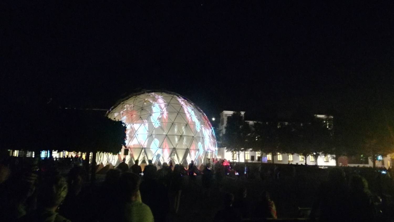 Bevor ich nun zu den drei Fassadenprojektionen komme, möchte ich noch ein weiteres Projekt der Wegeinstallationen vorstellen. Auf dem Beethovenplatz stand der Klima-Pavillon, in direkter Nähe des Haus der Frau von Stein. In dem Kugelgebäude gab es die Möglichkeit sich auszuruhen und gleichzeitig atmosphärische Videoshows jünger Künstler zum Thema Umwelt anzusehen. Aber auch Videos und Dokumentationen aus den letzten sechs Jahren Genius Loci gab es zu bestaunen.