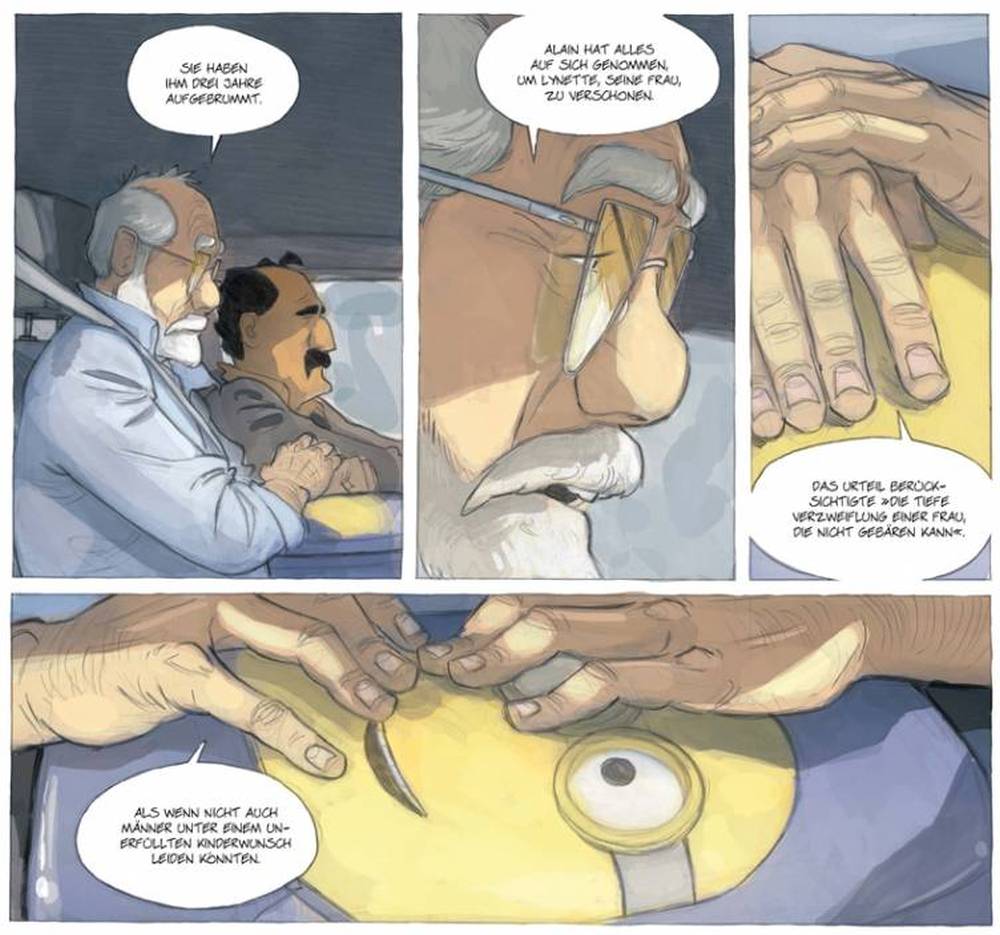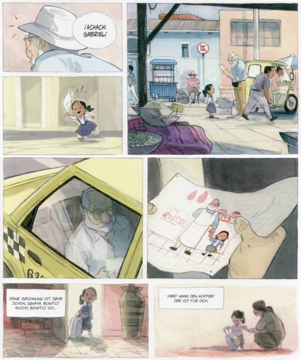 Der erste Band von „Die Adoption“ lebte vor allem durch die langsam wachsende Beziehung zwischen Gabriel und Qinaya. Dass das Ende dann wiederum so abrupt und tragisch war, beutelte mich als Leser schon massiv. Umso mehr erhoffte ich mir von der Fortsetzung, dass die geschichte ebenda ansetzt, wo Band Eins endete und die Thematik zwischen Gabriel und Qinaya erneut aufgreift. Leider wurde ich, was diese Erwartungen betrifft enttäuscht. Nicht nur, dass Autor Zidrou mal eben 18 Monate überspringt und die Ereignisse dieser Zeit in nur fünf Panels abhandelt, schmerzt schon ein wenig. Aber selbst die kleine Qinaya verkommt in band Zwei nur noch zu einer Statistin, wobei ihr dennoch eine übergeordnete Aufgabe zugeschrieben wurde, doch dazu später mehr. Ganze vier Seiten taucht die nun ältere Qinaya in diesem Band auf und dies in nur noch 19 Panels. Von „Beziehung“ keine Spur mehr. „¡Achchi Gabriel“ ist nun nur noch ein Besucher mit einem Geschenk. Und dennoch endet diese letzte persönliche Begegnung mit einem hochemotionalen Bild, als Gabriel von Qinaya ein handgemaltes Bild erhält, auf dem er mit ihr zu sehen ist, gemeinsam in seiner Metzgerei. Doch dies ist nicht Qinayas wichtigste Aufgabe in diesem Band.