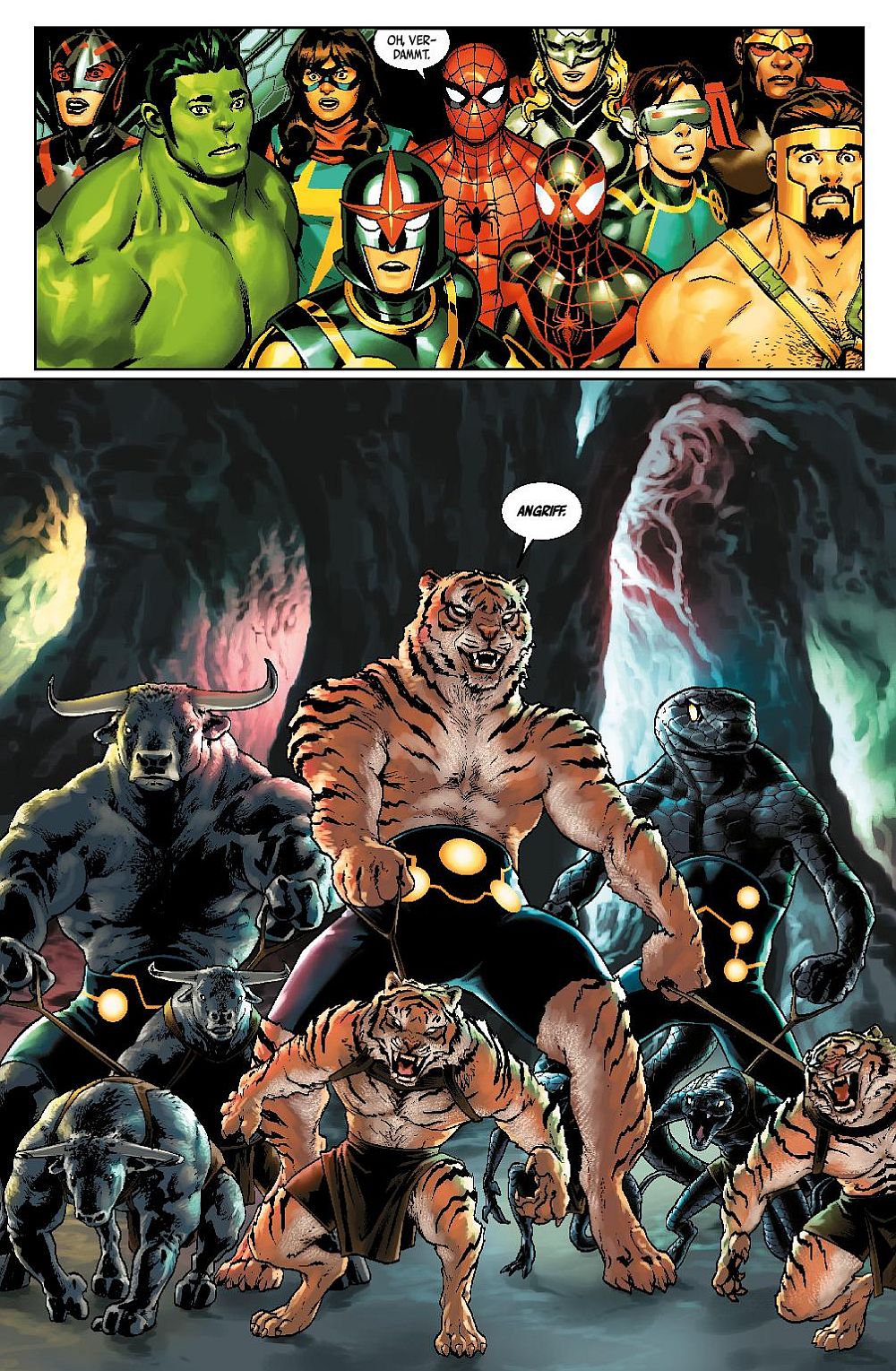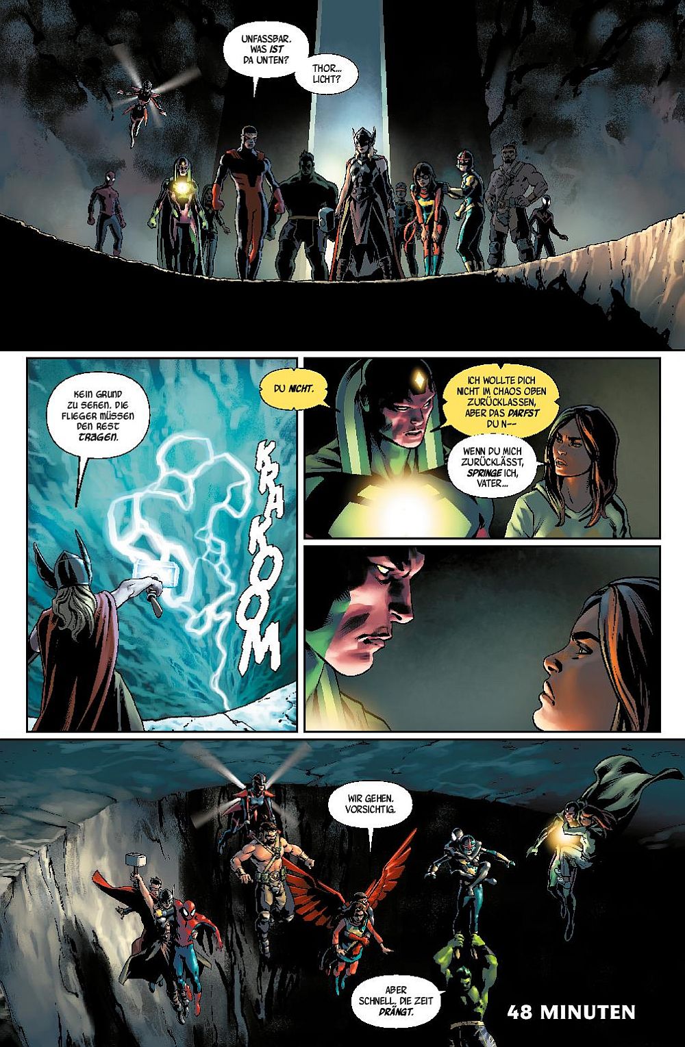 Das Heft beginnt, noch 58 Minuten bis zur Kollision mit der Erde. Die Zeit rennt, die Champions und die Avengers haben nicht mehr viel Zeit, die gefährliche Maschine zu finden. Dem Ziel etwas näher gekommen, stellen sich den beiden Teams furchterregende Monster entgegen. Viv und Vision haben ein klärendes Gespräch. Viv ist menschlich geworden, Vision wird sie eines Tages sterben sehen …