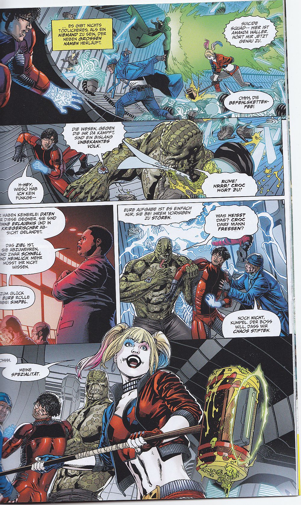 Ja wer ist den das? Simon Spurrier hat die Story in diesem Heft über den Auserwählten geschrieben. Als Crossed Leser kennt man Simon Spurrier. Simon Spurrier hat es drauf, coole, durchaus tiefer gehende Storylines zu schreiben. Ich bin sehr gespannt, ob das nicht nur bei Crossed funktioniert, sondern auch mit den Sucide Squad. Die neue Story um den Auserwählten fängt jedenfalls vielversprechend an und macht definitiv Lust auf mehr. Dem scheinbar Auserwählten wird die Hälfte der Zeit im Belle Reve erlassen, wenn er nachfolgende Mission mit den Suicide Squad überlebt. Aus der Sicht des Auserwählten ist die Geschichte geschrieben. Das ist sehr cool gemacht. Der Leser fiebert sofort mit ihm mit. Wir erfahren in Häppchen Kleinigkeiten über seine Person. Es gibt Rückblicke in seine Vergangenheit. Die Schlacht mit unbekannten Aliens und der Suicide Truppe ist in vollem Gang. Es gilt, über die unbekannten Aliens mehr zu erfahren. Wer sind sie, wo kommen sie her und was wollen sie überhaupt? Es scheint ein Ablenkungsmanöver zu sein. Viele unbekannte, sogenannte Namenslose, sterben wie die Fliegen. Der Auserwählte hat offensichtlich Angst, dass er auch zum Ablenkungsmanöver von Amanda Waller und der Suicide Squad gehört. Die einfachen Menschen kennt niemand beim Namen, sie tragen alle rote einheitliche Kleidung. Bisher schlägt sich der Auserwählte aber ganz gut. Achso, bevor ich es vergesse, der Auserwählte hat auch eine Art Begabung, er kann nahezu jedes Schloss öffnen …Ob ihm das letztendlich das Leben retten wird, erfahren wir nicht mehr in diesem Heft, denn so, wie es aussieht, sitzt er ganz schön tief in der Alien-Sch…