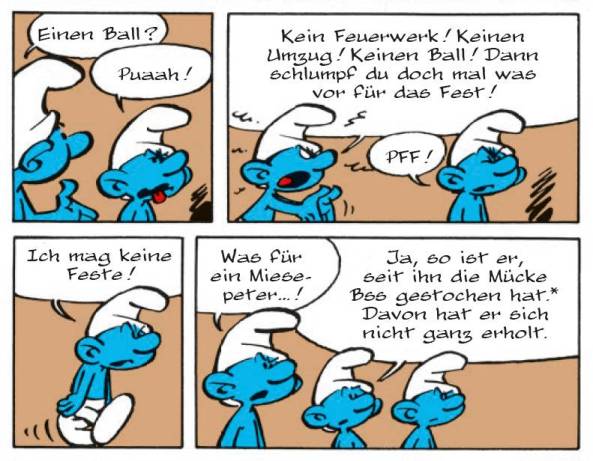 In diesem Abenteuer wird nicht nur erstmals Bezug auf frühere Ereignisse genommen, auch werden hier Folgen dessen dargestellt. So entwickelt der im ersten Abenteuer von der Mücke Bss gestochene Schlumpf ein dauerhaft griesgrämiges Verhalten. Zwar wurde bereits im ersten Band ein Schlumpf eingeführt, der sich als ein bisschen naiv und ja, zugegebenermaßen etwas dümmlich, aber hilfsbereit zeigte, doch erst in diesem Band erhält er mit seinem zweiten Auftritt wirklich Bedeutung und charakterliche Tiefe. Somit sind mit Band drei bereits drei Schlümpfe, mit Ausnahme von Papa Schlumpf, durch gewisse Charaktereigenschaften von den anderen Schlümpfen etabliert worden.