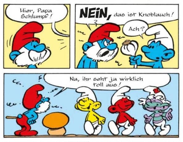 Zeichnerisch entwickelt sich das dritte Abenteuer nur unmerklich vom Vorgänger weiter. So lagen zwischen diesen beiden Abenteuern immerhin auch nur vier Monate. Zudem gibt es zahlreiche kreative Schlumpfversionen mit anderen Farben (auf die Schlumpffarbe gehe ich im nächsten Review noch einmal ausführlicher ein), anderen Mützen, mit Fell, größeren Ohren und Nasen, mit Schwanz und vielem mehr zu sehen. Es stellt sich dabei also die Frage, ob Peyo möglicherweise ein wenig mit dem Aussehen der Schlümpfe gespielt hat, um gewisse „Kreative Möglichkeiten“ auszutesten. Auch sonst zeigt dieses Abenteuer Anzeichen davon, dass Peyo mit seinen Kreationen noch ein wenig spielt. Statt eines klassischen Endes, mit Moral, Happy End und glücklichen Schlümpfen, präsentiert Peyo eher noch eine Art Gag, der als krönender Abschluss die Lachmuskeln herausfordern soll. Dies funktioniert zwar durchaus, der Weg dahin offenbart aber auch einen Schlumpf mit einem verhalten, welches so überhaupt nicht typisch schlumpfig ist.