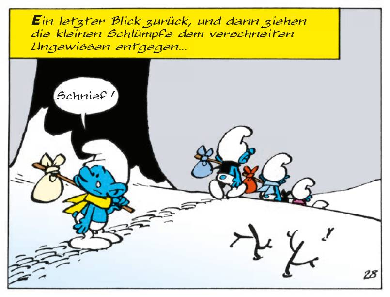 Nachdem die zunehmende Arbeit für Peyo dazu führte, dass zwischen dem dritten und vierten Mini-Recit ein Jahr und zwei Monate Pause lagen, entstand das fünfte Abenteuer in weniger als sechs Monaten. Den Grund hierfür erfahrt im heutigen Review, in dem die Schlümpfe eine schwerwiegende Entscheidung treffen müssen, um das eigene Überleben zu sichern. Doch wer die Schlümpfe kennt weiß, dass sie fast alle Gefahren meistern, wenn sie nur zusammenhalten und damit verrate ich nicht einmal wirklich viel und morgen folgt dann auch schon der Abschluss der Geburtstagswoche …