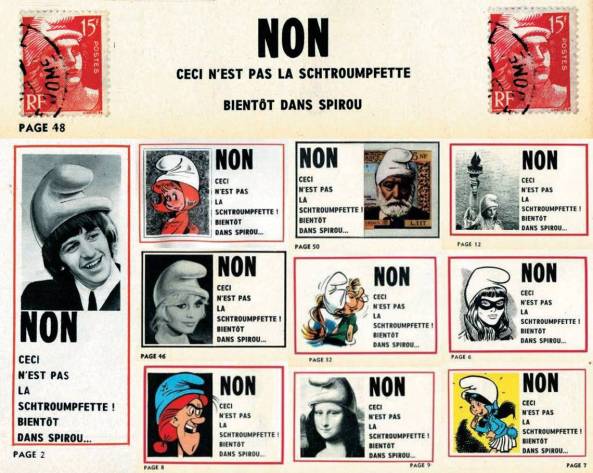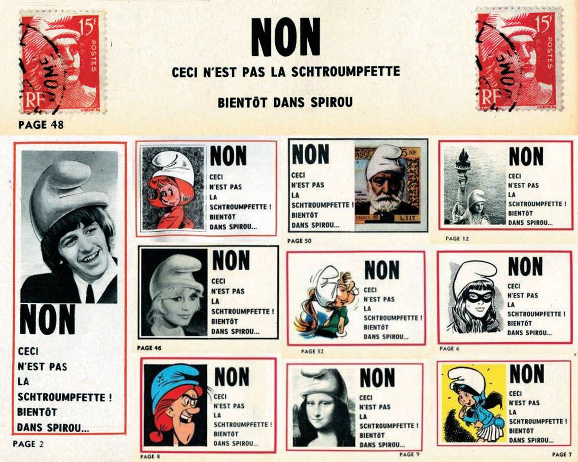 Die ersten sechs Abenteuer erschienen innerhalb von ca. zweieinhalb Jahren. „Die schwarzen Schlümpfe“ am 2. Juli 1959, „Der gefangene Schlumpf“ am 17. Dezember 1959. Etwas weniger als vier Monate später, am 7. April 1960, erschien „Das Zauberei und die Schlümpfe“ und wiederum etwas mehr als 1 Jahr und 2 Monate später, am 26. Juni 1961 „Der falsche Schlumpf“. Die letzten beiden Mini-Alben erschienen am 14. Dezember 1961 „Die Schlümpfe in Not“ und zuletzt „Der hundertste Schlumpf“ am 15. Februar 1962. Ab Spirou 1303 vom 4. April 1963, also über ein Jahr nach „Der hunderteste Schlumpf“ schafften die Schlümpfe den Sprung ins Großformat, mit dem Abenteuer „Der fliegende Schlumpf“ eine neue 20-seitige Geschichte. Doch warum nur 20 Seiten? Dies resultiert aus einer Änderung, auf die ich im Special näher eingehen möchte und hier stattdessen lieber das Augenmerk auf ein späteres Abenteuer, aber sehr wichtiges Abenteuer lenken möchte. Es ist das Jahr 1966, als Peyo beschließt die Schlumpfgemeinschaft, um einen weiteren Schlumpf zu erweitern. Vorankündigungen lassen die Leser bereits aufhorchen. „Non ceci n’est pas la schtroumpfette bientôt dans spirou“ heißt es da, neben Figuren mit Schlumpfmützen. Ja, peyo führte einen weiblichen Schlumpf ein, der als perfider Plan von Gargamel entstand. Im Zaubertrank für Schlumpfine heißt es, abweichend vom normalen Schlumpfzauber: „Ein Hauch Koketterie… eine feste Schicht Voreingenommenheit… drei Krokodilstränen… eine Prise Gerissenheit […] Dummheit und List zu gleichen Teilen…“. Dieses Rezept will Delporte nicht mit verantworten und schiebt alle Schuld auf Peyo. Der wiederum versucht sich aus der Verantwortung zu ziehen, indem er einen Zusatzhinweis zum Zauber ergänzt: „Verantwortlich für diesen Text ist ausschließlich der Autor des Zauberbuchs „Magicae Formulae“, Beelzebub Verlag“. Dies schützt ihn jedoch nicht vor den Konsequenzen. Seine Frau Nine spricht vierzehn Tage lang nicht mit ihm und nennt ihn sogar einen Frauenfeind. Doch es gab ein noch größeres Problem. Wie sollte die Schlumpfine aussehen? Er fand keine Lösung, was sogar dazu führte, dass er nachts aufwachte und weinend auf der Bettkante saß, angesichts des immer näher rückenden Abgabetermins und so wendete er einen Kniff an, um noch etwas Zeit zu schinden. Auf der zwanzigsten Seite des Abenteuers präsentiert Papa Schlumpf die neue Schlumpfine einer wie vom Donner gerührten Schlumpfschar. In Panik kreiert er eine blonde Schlumpfine ist aber selbst von seiner Kreation nicht überzeugt. Die eher verhaltenen Reaktionen seiner Kollegen bestätigte ihn darin. Also zeichnete er weiter, korrigierte, zeichnete neu, änderte und verwarf vieles wieder. Peyo war verzweifelt und bat seinen Freund Franquin um Rat. Der sah sich den ersten Entwurf an und fand ihn hervorragend. Peyo veröffentlichte eher widerwillig die neue Schlumpfine, die zum Erfolg wurde. Doch auch Nine bestätigte „André hat ihn ein bisschen beruhigt, Pierre ließ diese Schlumpfine erscheinen, aber widerstrebend, denn er mochte sie nicht. Und mir war sie hässlich, mit ihren schwarzen Haaren lieber gewesen: Sie hatte viel mehr Charakter!“