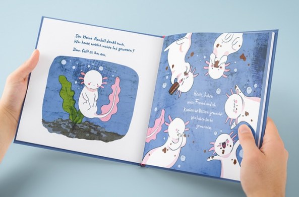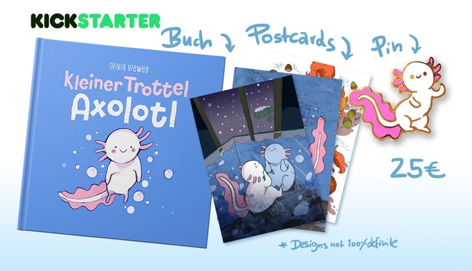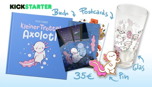 Unterstützt ihr das Projekt mit 35 Euro gibt es das 48-seitige Büchlein „Kleiner Trottel Axolotl“ in der Hardcoverausgabe, das 5-teilige Postkartenset, den goldglänzenden Axolotl-Pin und ein Axolotl-Trinkglas. Wer möchte kann dann ab Dezember 2018 in die Axolotl-Welt eintauchen.