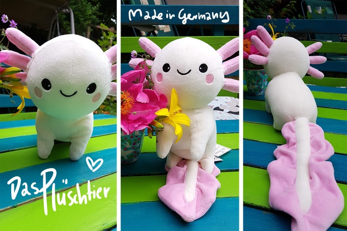 Für 60 Euro Beitrag gibt es einen knuddelig süßen Axolotl aus Plüsch, plus den goldglänzenden Axolotl-Pin. Und dann könnt ihr ab Dezember 2018 mit dem kleinen Axolotl kuscheln.