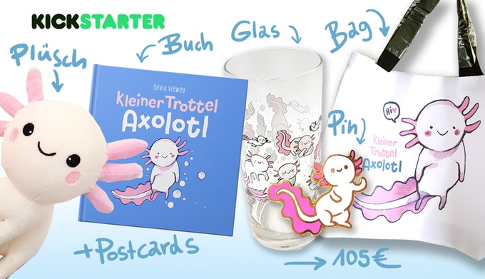 Als Mega-Axolotl-Paket gibt es für 160 Euro das 5-teiligen Postkartenset, das 48-seitige Hardcover von „Kleiner Trottel Axolotl“, den goldglänzenden Axolotl-Pin, das Axolotl-Trinkglas, den knuddelig süßen Axolotl aus Plüsch und die Axolotl-Tasche. Aber es gibt noch eine mit Aquarellfarben kolorierte Zeichnung im A5-Format. Dieses Paket gibt es ebenfalls ab Dezember 2018. Diese Belohnung ist auf 15 Stück limitiert.