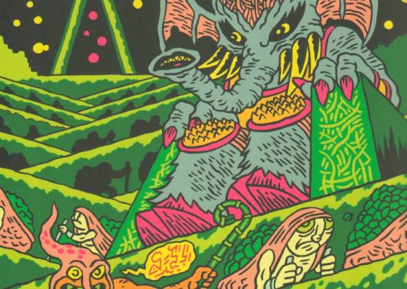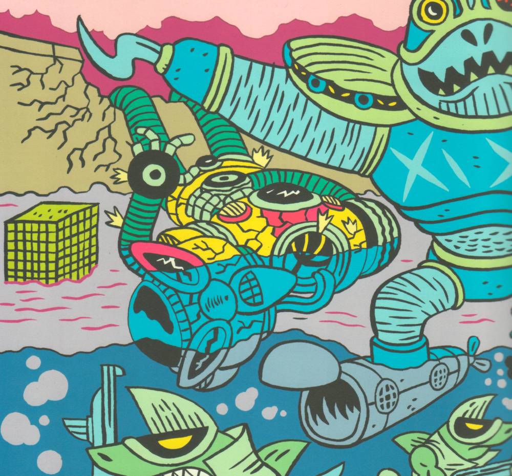 Einen Zaunpfahl spürt man manchmal auch beim Artwork auf dem Kopf. Schräg, schräger, am schrägsten. So, oder ähnlich könnte man den Stil der Ausgabe bezeichnen. Auf den ersten Blick eher einfach strukturiert könnten die Bilder fast schon abschreckend wirken, wenn man sich nicht bewusst ist, auf was man sich hier einlässt. Ja, wer realistische und naturgetreue Zeichnungen sucht, der wird enttäuscht werden. Fantasie, Expressionismus, das Ungewöhnliche steht hier im Vordergrund. Starke Linien, grelle Farben, eher disharmonische Farbkombinationen und Figuren, die auf den ersten Blick alles andere als charmant, oftmals sogar eher abstoßend, sind. „KAIJOE“ ist auch kein Comic. Wenn man es schon so richtig kategorisieren will, dann würde es noch am ehesten als Light Novel durchgehen. Zwar sind die Bilder/Zeichnungen gegenüber dem Text in der Überzahl, aber es gibt nur wenig comictypische Elemente. Kaum Sprechblasen (2), Textboxen oder Soundwörter (2). Es ist sogar so, dass die gesamten Zeichnungen visuell akustisch gesehen sogar eher stumm daherkommen. Aber es gibt auch Zeichnungen, die einem ungewohnt vertraut vorkommen, wie im letzten Absatz bereits erwähnt. Dies liegt unter anderem in Kowalczuks Einflüssen. So gibt es zum Beispiel eine Seite, die mich persönlich sofort an ein altes Gameboy RPG (ala „Mystic Quest“) erinnerte. Sowohl von der Darstellung als auch von der Farbgebung her.
