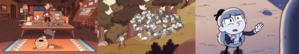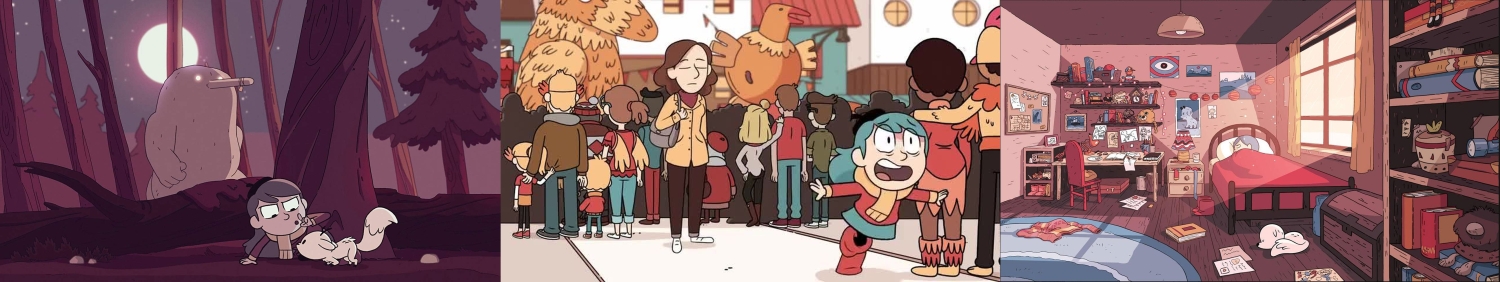 Optisch orientiert sich die Serie am Stil der letzten drei Bände, in denen alles ein wenig runder gestaltet wurde. Diese „Verniedlichung“ geht zum Glück nicht zulasten der Glaubwürdigkeit der Figuren, oder der Bedrohlichkeit einiger Gegner. Vielmehr wirkt so alles harmonischer und die Figuren bilden auch mit dem ebenfalls sehr schön gezeichneten Hintergrund eine gelungene Symbiose. Wer nun denkt, dass so eine frische und lebensfrohe Serie mit grellen und leuchtenden Farben überzeugt, der wird (glücklicherweise?) enttäuscht werden. Denn die Farben in Hilda sind allesamt eher gedeckt, pastellartig und beruhigend, ohne dabei farb- und leblos zu wirken. Vielmehr hat es Luke Pearson geschafft die Freude und Lebenslust nicht durch die Optik, sondern alleine durch die Figuren zu transportieren. So setzt sich auch der minimalistisch simple Stil der Figuren und Hintergründe in der Farbwahl fort.