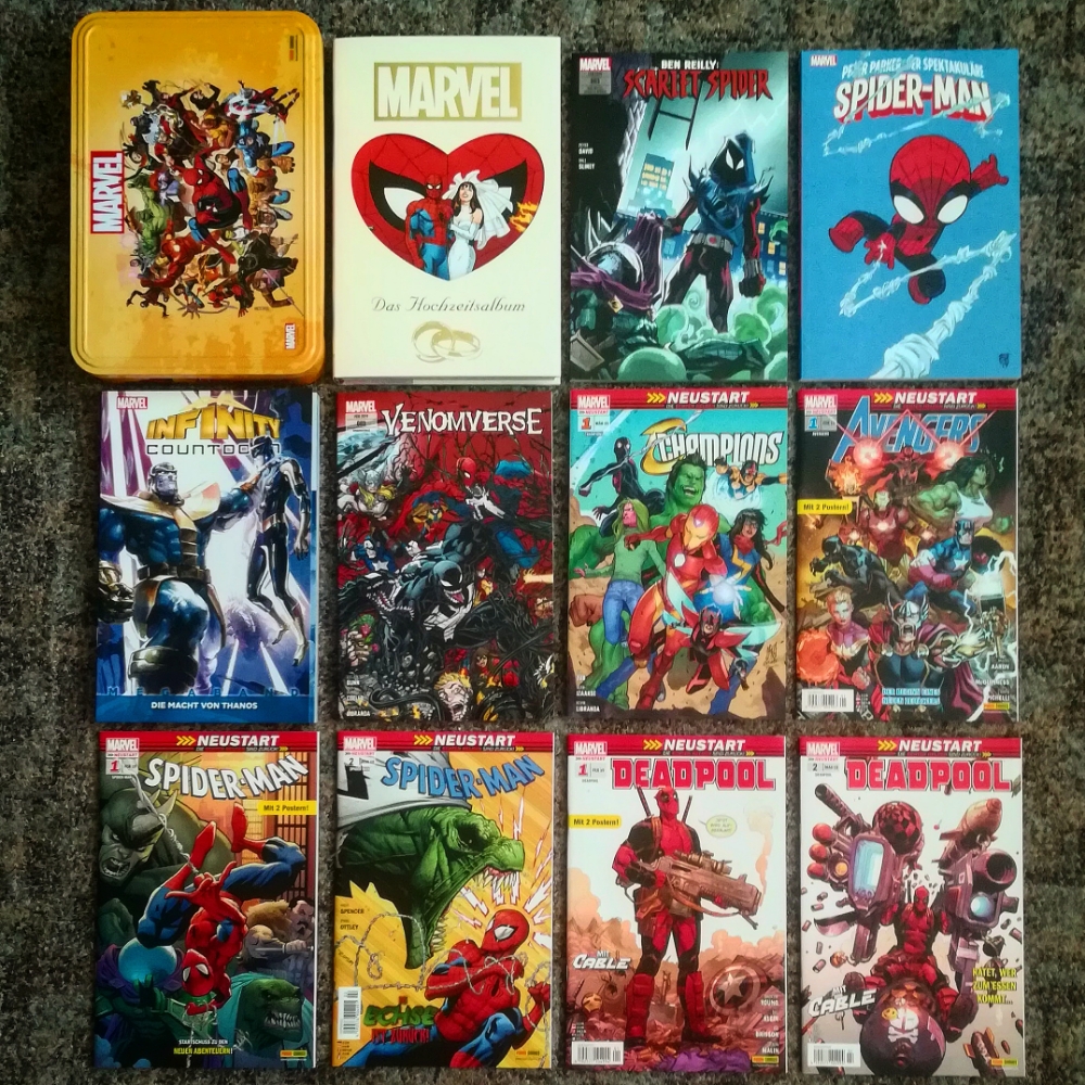 Nun geht es mit dem zweiten Bild weiter und hier sammelt sich meine aktuelle Comiclieferung von meinem aktuellen Comchändler des Vertrauens, mit dem ich diese Woche wieder ein wunderbares Telefonat hatte. Und das Paket war so riesig, dass ich auch hier nicht alles sofort sichtbar auf das Foto bekommen habe, wobei ja doch schon irgendwie alles drauf ist. Highlights sind auf jeden Fall die Marvel Neustart Box, wobei ich meine ein wenig erweitert habe, gegenüber der regulär erhältlichen Version und das Marvel Hochzeitsalbum. So habe ich derzeit zwar nicht die richtige Frau an meiner Seite, dafür aber schon das passende Hochzeitsalbum. 😀