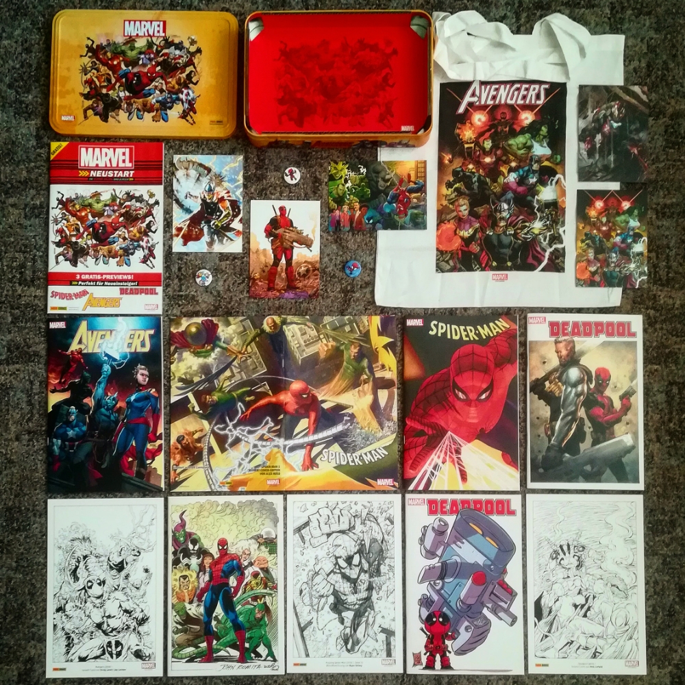 Das dritte und letzte Bild zeigt euch den Inhalt meiner Marvel Neustart Box. Neben den regulären Variantcovern von Avengers Nr. 1 von Mahmud Asrar, Deadpool Nr. 1 vo Jerome Opena, Spider-Man Nr. 1 von Alex Ross und den drei Artprints Avengers von Greg Land und Jay Leisten, Deadpool von Rob Liefeld und Spider-Man von Ryan Ottley sind nämlich noch enthalten: Deadpool Nr. 1 Variant von Skottie Young, Spider-Man Nr. 1 Variant von Alex Ross, Spider-Man Nr. 1 Variant von John Romita Sr. (BluBox), der Gratis Comic vom Marvel Tag, den Einkaufsbeutel, drei Pins und fünf Postkarten …