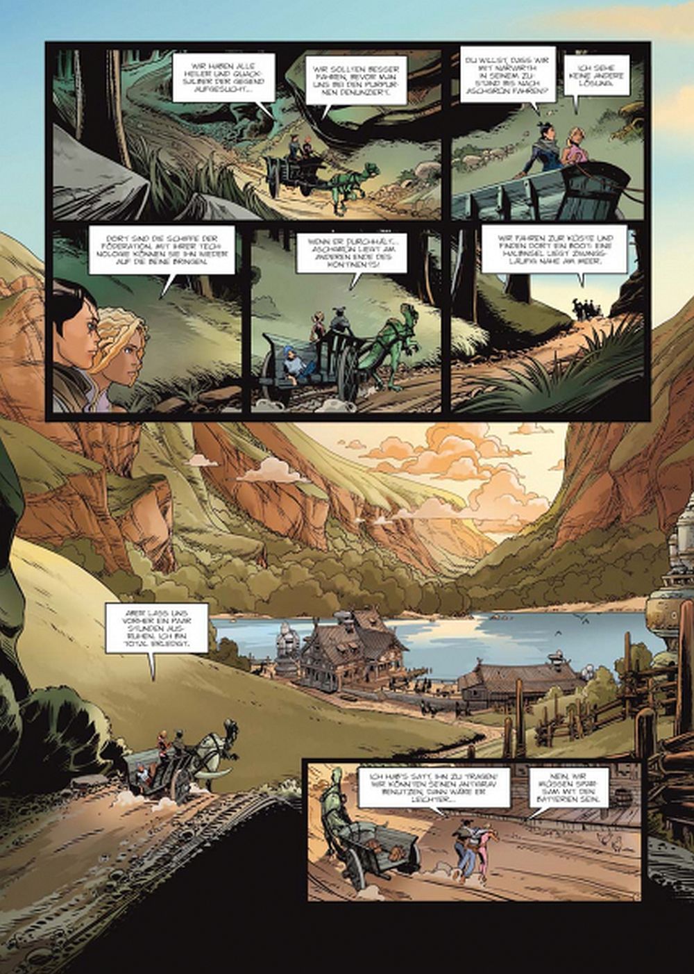 Diese Fragen werden mit einem Cliffhanger weitestgehend beantwortet. Der Band hat mir sehr gut gefallen, weil er sich mehr auf die Figuren konzentriert und einem linearen Weg, nämlich dem Weg mit dem Imperator Express nach Aschgrün, konzentriert. So bleibt die Handlung einfach, verstrickt sich nicht und macht zeitgleich auch noch Freude. Schöne und auch lustige Momente gibt es, wenn Granit ihrer Arbeit als Stewardess nachgeht. Sie hat es einfach nicht leicht mit manchen Gästen. Es macht Spaß zu lesen, wie der Zug den Gefahren trotzt und welchen Gegnern Granit auf dem Zug alles begegnet. So hat mir der Band sehr gut gefallen, die Zeichnungen sind wie immer äußerst ansehnlich und die Farben passen sich den schönen Zeichnungen, kräftig aber nicht knallbunt, an. Jetzt freue ich mich wieder riesig auf eine kommende Ausgabe der Schiffbrüchigen von Ythaq.