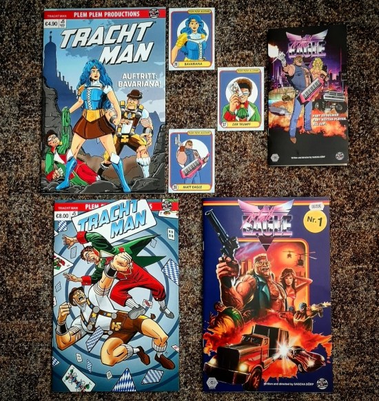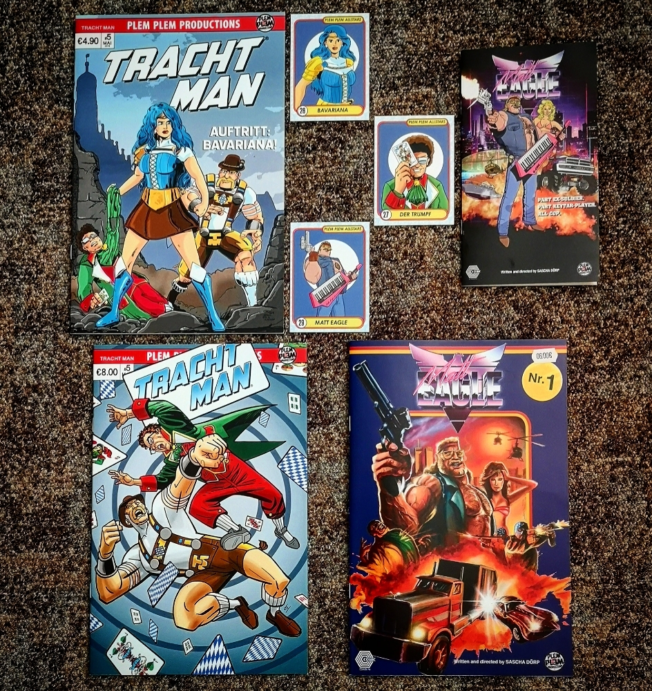 Im Plem Plem-Paket waren die restlichen Tracht Man #5-Ausgaben plus das 80er-Jahre-Actionhighlight von Sascha Dörp „Matt Eagle“, plus die Preview und passende Plem Plem Trading Cards.