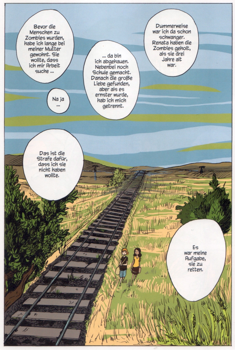 Zuerst einmal muss ich sagen, dass diese Veröffentlichung nicht nur die erste und ursprüngliche Fassung von Olivia Viewegs Endzeit darstellt, sondern auch ihre Abschlussarbeit an der Weimarer Bauhaus-Universität. Die Geschichte ist spannend, die Figuren charakterlich sehr gut ausgearbeitet und als Leser freundet man sich auch sehr schnell mit Vivi und Eva an. Die Beweggründe der Beiden für ihre Reise sind nachvollziehbar. Auch wenn ich die Geschichte recht schnell durchgelesen hatte, was hier aber keinerlei Indiz für eine flache Handlung sein soll, sondern mehr dafür steht, dass ich so richtig schön in die Handlung eintauchen und mitfiebern konnte, dass ich den Band einfach nicht weglegen wollte, bevor ich fertig war.