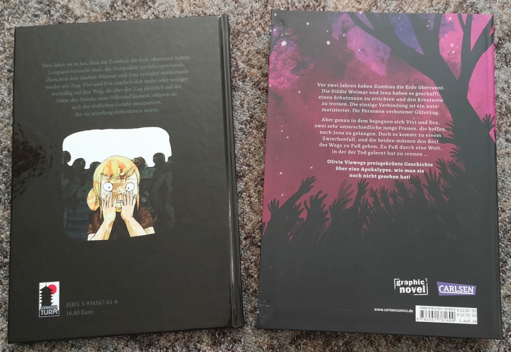 Zuerst fällt auf, dass die 2012er Version wesentlich dünner ist. Mit 80 Seiten ist diese knapp dreieinhalb mal schmaler, als die 2018er Veröffentlichung. Dies liegt aber nicht am Papier, das bei der 2018er Fassung nur unmerklich kräftiger ausfällt und im Gegensatz zur 2012er Fassung matt statt seidenglänzend ist, sondern vor allem in der erweiterten Handlung. Olivia hat der Handlung einige ergänzende Szenen spendiert und sogar teils tiefgreifende Änderungen in der Charakterisierung ihrer beiden Heldinnen vorgenommen. Eines, welches ich erwähnen möchte, ohne hoffentlich zu viel zu spoilern ist, dass Vivi in der 2012er Fassung ihre Tochter an die Zombies verliert, während es in der 2018er Version ihre jüngere Schwester ist. Dennoch gibt es mit der Gärtnerin Übereinstimmungen, auch wenn diese anders verlaufen. Zudem setzt die Geschichte in der Neuveröffentlichung schon einige Tage vor dem Treffen von Vivi und Eva ein. Mehr möchte ich auch schon nicht verraten. Beide Handlungen haben meiner Meinung nach ihre Berechtigung und während die 2018er Version viel der Fantasie des Lesers überlässt, werden in der 2012er Version viele der Fragen direkt beantwortet.