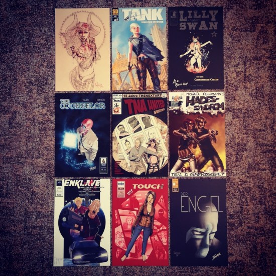 In den letzten fünf Wochen war es was Neuzugänge betrifft relativ ruhig. Dafür sollte es jetzt wieder ein wenig mehr werden, da ich derzeit noch auf die nächste Lieferung meines Stammhändlers warte und diese Woche zwei unterstüttzte Kickstarter-Projekte den Weg zu mir gefunden haben. Einerseits der zweite Band von Ralf Singh und Thorsten Brochhaus‘ „Zinnober“, wo ich mich bei Kickstarter für ein schönes Set mit T-Shirt entschieden habe. AUßerdem ist da noch das Crossover zum 15-jährigen Verlagsjubiläum von TheNextArt „TNA United Switched“ mit signierten Prints zu den Erstausgaben von Heftserien der beteiligten Künstler. Damit ich euch das auch schön präsentieren kann, gibt es diesmal zwei Fotos …