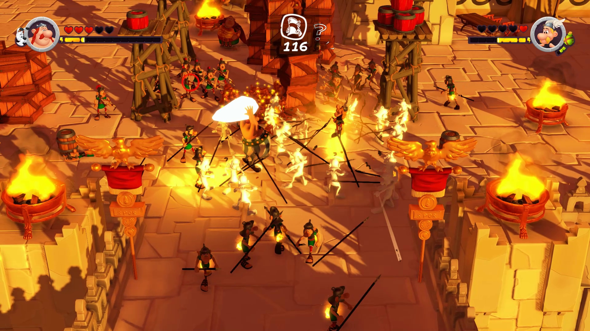 Als erstes fällt in Sachen Gameplay auf, dass das Spiel selbst zwar recht dreidimensional wirkt, aber tatsächlich nur ein, sagen wir mal, maximal 2,5D-Spiel ist. In einer leichten Schräg-von-oben-Draufsicht steuert man seine beiden Figuren. Statt also wie bisher seine Figuren durch eine „einigermaßen“ 3D-Welt zu schicken verzichtet man jetzt darauf. Dies wirkt für Spieler der beiden Vorgänger im ersten Moment etwas befremdlich, zeigt aber schnell auch gewisse Vorteile, auf die ich beim nächsten Punkt näher eingehen werde. Als nächstes merkt man den Verlust einer bisher wichtigen Eigenschaft, was aber wiederum das taktische Denken fordert. Denn weder Asterix noch Obelix können springen. Stattdessen haben beide eine kurze „Sprint“-Funktion erhalten, mit denen sie kleinere Abgründe überwinden können. Die nächste wichtige Neuerung ist ein kompletter Coop-Modus. So kann man das vollständige Spiel mit einem zweiten Spieler gemeinsam durchspielen. Was ich auf jeden Fall schon einmal anmerken kann ist, dass der Zweispielermodus den Schwierigkeitsgrad enorm absenkt. Denn auch wenn ich mich selbst als erfahrenen Spieler bezeichnen möchte, immerhin spiele ich seit über 30 Jahren Videospiele, ist selbst der einfache Schwierigkeitsgrad teilweise extrem heftig. Dies liegt aber vor allem an den rar gesäten Zwischenspeicherpunkten. Gerade dann, wenn man in einem der vielen Römerläger ist, welche sich über mehrere Abschnitte erstrecken, und kurz vor Schluss stirbt, muss man wieder ganz von vorne anfangen und sich durch das gesamte Lager kämpfen. Hier wäre es angebracht gewesen, zwischen den einzelnen Abschnitten einen Zwischenspeicherpunkt zu setzen. So entsteht unnötiges Frustpotenzial, was einen dazu bringt den Controller zur Seite zu legen, obwohl man gerne weiterspielen würde, aber keinerlei Lust hat die immer gleichen Abschnitte durchzuackern, nur um in der Geschichte vorwärts zu kommen. Außerdem wäre es gut gewesen, wenn man die Lager ein zweites Mal passieren muss, dass man eventuell diesen Abschnitt überspringen kann, wenn man möchte, da man ihn ja bereits einmal abgeschlossen hat. Spielt man im Einzelspielermodus steigt der erwähnte Frustlevel noch einmal um einiges an, da die vom Computer gesteuerte Figur recht passiv ist. So hilft sie euch gerade in Kämpfen, bei denen mehrere Gegner auf euch einstürzen nur recht wenig. Alle zwei bis drei Minuten mal ein Hieb, während eure Figur im selben Zeitraum vier bis fünf Gegner erledigt hat, sofern ihr so lange durchhaltet. Denn bei bis zu sechs Gegnern, die gleichzeitig auf euch einstürmen, wird es manchmal ziemlich nervig.