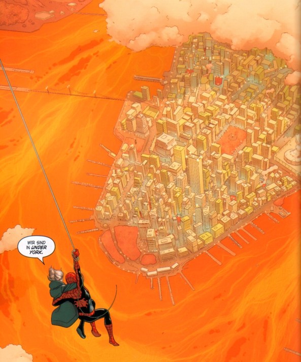 Nun haben Tom Taylor, Juann Cabal und Yildiray Cinar eine weitere neue Serie aus der Taufe gehoben, die sich mehr mit Peter Parker und seiner neuen Nachbarschaft beschäftigen soll. Diese im Original auf zwölf Hefte angelegte Maxiserie wird nun von Panini in zwei Sammelbänden auch auf Deutsch veröffentlicht. Im hier vorliegenden ersten Band lernt Peter nicht nur die neue „alte“ Heldin Rumor kennen, sondern erfährt auch, dass unter New York eine weitere Stadt existiert, die offenbar durch einen Waffenstillstand und andere Vereinbarungen seit Anfang des 20 Jahrhunderts eine Art Koexistenz zum oberhalb liegenden New York führt. Mit einerseits sehr skurrilen und fantastischen Ideen und andererseits sehr menschlichen Emotionen und Problemen schafft Autor Tom Taylor gemeinsam mit den Zeichnern Juann Cabal und Yildiray Cinar, plus Marceilo Ferreira in einer Kurzgeschichte, eine sehr unterhaltsame und kurzweilige Spider-Man-Serie, die vorrangig auf die Kleinigkeiten des Leben setzt und auch mit Humor nicht geizt, ohne dabei zu lächerlich zu wirken.