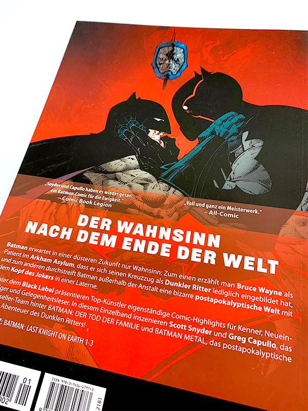 Das dann als Zeichner auch nur ein Greg Capullo in Frage kommt, versteht sich eigentlich fast von selbst, da dieses Team nicht umsonst, als das Dream-Team hinter den erfolgreichsten und besten Batman-Storys des letzten Jahrzehnts angesehen wird. Capullos filigraner und dennoch dominanter Zeichenstil ist genau das richtige Artwork. Egal welches Szenario Snyder sich ausdenkt, Capullo schafft es dies glaubwürdig in Szene zu setzen. Interessant ist auch Capullos Interpretation von Batmans Freunden und Wegbegleitern in dieser postapokalyptischen Welt. Aber auch wie er mit dem Kopf Jokers arbeitet und es alleine mit der Mimik schafft das gesamte Spektrum der Gefühlswelt des verrückten Clowns darzustellen.