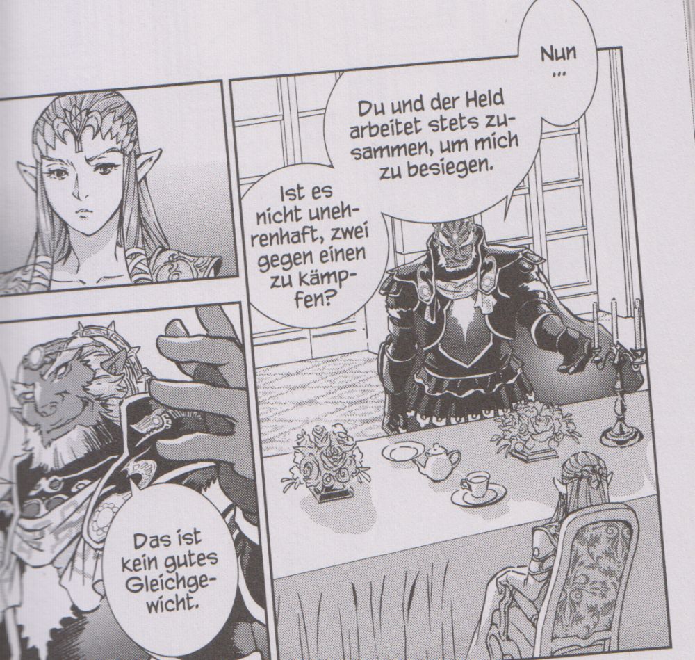Diese Mangareihe liest sich angenehm leicht von der Hand. Wie bereits erwähnt, kann sich der Autor mit der Geschichte zum Spiel sehr viel Zeit lassen, da die Manga Reihe nicht auf nur einen Band oder zwei beschränkt ist. Das ist meiner Meinung nach genau richtig so, denn die Charaktere kommen viel mehr zur Geltung und können beim Ausbau der Story intensiviert werden. So hat der Manga enorm viele Möglichkeiten, die Ruhe nach dem Sturm beim Lesen auch spürbar zu machen. Gerade zu Beginn dieser Ausgabe wird dies sehr deutlich, wenn Link in einer einsamen Hütte nach schweren Verletzungen erwacht und sich erst einmal orientieren muss. Wer ist die junge Dame, die ihm täglich Nahrung und Getränke bringt? Bis Link soweit genesen und bereit ist, die Hütte zu verlassen, vergehen knapp einhundert Seiten. So erfahren wir, wer Anika ist und was ihre Beweggründe sind. Diese Momente sind wirklich sehr emotional gestaltet. Beim Lesen spürt man die emotionalen Tränen auf den Seiten der Protagonisten förmlich. Das hat mich doch etwas überrascht, dass sich dieser Band so einer enormen Intensität hingeben kann. Link hat sich in dieser Zeit auch einigen Fragen des Schicksals zu stellen. Wo muss er sich als nächstes hinbegeben, was hat es alles mit dem Master Schwert auf sich? Dann wechselt der Manga die Perspektive. Link ist nun bereit aufzubrechen, doch nun lesen wir über Ganondorf und Prinzessin Zelda. Ganondorf sitzt mit Prinzessin Zelda an einem Tisch und trinkt Tee. Jetzt erfährt der Leser die Pläne und Zusammenhänge rund um das Böse. Zelda, Link und Ganondorf (DAS TRIFORCE), sie sind alle miteinander verwoben und auf ewig verbunden. Währenddessen macht sich Link auf die Suche nach der Zitadelle der Zeit. Dort angekommen begegnet er dem Helden der Zeit. Dieser hat damals Ganondorf besiegt und Zelda drehte die Zeit um sieben Jahre zurück. Durch diesen Twist wurde damals Ganondorf hingerichtet, bevor er seine bösen Pläne umsetzen konnte. Doch Ganondorf bündelte alle Kräfte der Schattenwelt und ist nun mächtiger den je. So ist er zurückgekommen und giert nach allen drei Teilen des Triforce.