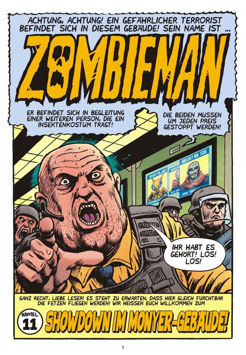 Auf altem holzigen Papier kommt eine Zombieman Geschichte immer gut an. In diesem Heft kommt es zum Showdown im Monyer-Gebäude. Der Zombieman und sein Kollege, der mutierte Maiszünsler, welcher mit seinem Kot enorme Sprengkraft aufweisen kann, versuchen aus dem Gebäude zu entkommen. Die Flucht ist natürlich ordentlich in Szene gesetzt und gestaltet sich nicht so leicht. Immer wieder kommen die Sicherheitskräfte und durchkreuzen einen Fluchtversuch aus dem Gebäude. Selbst die oberste Abteilung kommt nicht ohne die Unterstützung des Adlers aus, dieser lässt sich jedoch enorm viel Zeit, ehe er endlich zur Unterstützung auftaucht. Der Leser fragt sich bestimmt, auf welcher Seite der Adler eigentlich steht, kämpft er nicht für das Gute und will Deutschland beschützen? Bevor die aussichtslose Situation komplett eskaliert, erhält Zombieman vom Chef ein lukratives Angebot. Nimmt er dieses Angebot an? Lest selbst, wie der Adler dazu steht und die Geschichte ein fulminantes Ende nimmt.