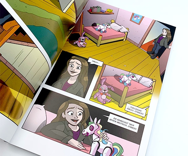 Nicht nur die Autoren sind alte Recken des Original-Videospiels. Auch die aus Deutschland stammende und in Salzgitter lebende Zeichnerin Claudia Schröder hat „Five Nights at Freddy’s“ mit ihren Figurenentwürfen geprägt, wie kein anderer. Wer sich jetzt wundert, weil Claudias Name so nicht bei den Credits des ersten Games auftaucht, dem sei ihr Alter Ego „Pinky Pills“ genannt. Auch wenn Claudias Artwork auf den ersten Blick ein wenig merkwürdig und „kindisch“ wirkt, entwickelt es sich sehr schnell zu einer echt gruseligen Komponente, weil der Horror so noch creepyer wirkt. Auch die Graphic Novel funktioniert nach dem Prinzip, dass sich der wahre Horror vorrangig im Kopf abspielt und dies schafft Claudia Schröder sehr gut.