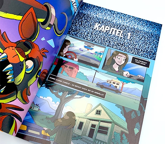 Freunde des Spiels werden sich sofort heimisch fühlen, und auch jene die bisher keine Berührungen mit einem der Spiele hatten, aber sich für Psycho-Mystery-Horror begeistern können, werden sicher begeistert sein. Alle die nach klassischem Splatter und Slasher-Horror suchen, sind hier aber komplett falsch. Denn auch wenn die Games dem Survival-Horror-Genre zugeordnet werden und ihre Faszination durch den gezielten Einsatz der Jumpscares (plötzlich auftauchende Schockmomente) bezieht, spielt sich der eigentlich Horror, wie bereits erwähnt, im Kopf des Spielers ab. Dass dies in der Graphic Novel so nicht funktioniert, dürfte jedem klar sein. Dennoch haben es die Macher von FNAF, wie Five Nights at Freddy’s unter Fans abgekürzt wird, auf wundervolle Weise geschaffte, den Stil und das Feeling der Spiele in diesem Band einzufangen.