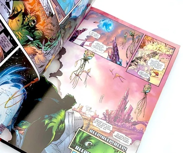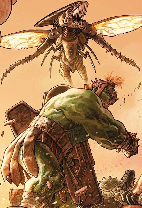 Optisch ist der Band solide, hat mal bessere und mal schlechtere Momente, wirkt aber insgesamt sehr harmonisch. Bitte nicht falsch verstehen. Es sieht schon mächtig imposant aus, was Carlo Pagulayan und Aaron Lopresti hier aufs Papier gezaubert haben. Die Komplexität von Sakaar und seinen Völkern ist durchaus atemberaubend, vor allem wenn man bedenkt, dass hier eine komplette Welt mit einer interessanten politischen Hintergrundgeschichte einfach so aus dem Nichts gestampft wurde, und dennoch sehr stimmig wirkt, trotz all ihrer unterschiedlichen Territorien und Lebewesen. Sieht man aber hiervon einmal ab, ist Pagulayans und Loprestis Zeichenstil doch recht ähnlich. Der Vorteil hieran ist, dass jeder Mehrteiler, wovon es letztendlich vier Stück in diesem fast 400 Seiten starken Hardcoverband gibt, kaum visuelle Unterschiede aufweist, was dem Lesefluss meiner Auffassung nach zuträglich ist. Die einzigen Ausnahmen sind das Artwork von Takeshi Miyazawa und Gary Frank.