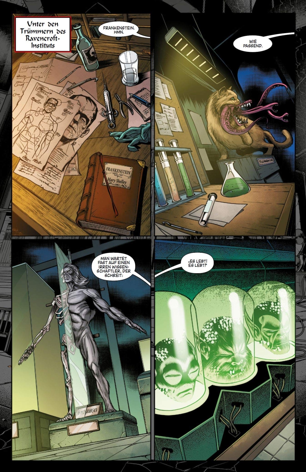 Tja, nun kommt der schwierige Teil in Reviews, die Zeichnungen und das Artwork zu beschreiben. Dies ist vor allem deshalb nicht einfach, weil hier unweigerlich die persönlichen Vorlieben und eigene Empfindungen mit einfließen, die sich einfach nicht objektiv bewerten lassen. So kann ein Zeichner rein technisch sehr gute Arbeit abliefern, es aber unter Umständen dennoch nicht schaffen mich zu begeistern, wogegen es wiederum möglich ist, dass ein nicht so talentierter und weniger „guter“ Zeichner mich vollends überzeugt und absolut flasht. Im vorliegenden Fall ist es zumindest so, dass das Artwork von Angel Unzueta in meinen Augen nur wenige Anhaltspunkte zur Kritik bietet. Unzuetas Zeichenstil erinnert ein wenig an die klassischen Horrorgeschichten, welche auch sehr gut in Schwarz/Weiß funktionieren, weshalb ich mir eine klassische S/W-Version der fünfteiligen Ravencroft-Miniserie gut vorstellen kann. Die Aushilfe von José Luis hingegen wirkt wie eine lieblose Bagley-Kopie und kann mir nur wenig Zustimmung abgewinnen, obwohl ich ein großer Bagley-Fan bin. Die Carnage- (Guiu Vilanova), Sabretooth- (Guillermo Sanna) und Dracula-One Shots (Stefano Landini) sind allesamt extrem stimmungsvoll und zeichnerisch genial umgesetzt, sodass ich hier gnadenlos begeistert bin, aber auch zugeben muss, dass diese vermutlich in einer S/W-Fassung wieder sehr viel von ihrer Stimmung verlieren könnten. Allerdings muss ich erwähnen, dass besagte Zeichner in den One Shots lediglich für die Rückblenden verantwortlich sind und die aktuellen Ereignisse auch hier aus Angel Unzuetas Feder stammen. Diese Mischung ergibt ein nahezu perfekt stimmiges Gesamtbild des vollständigen Bandes.