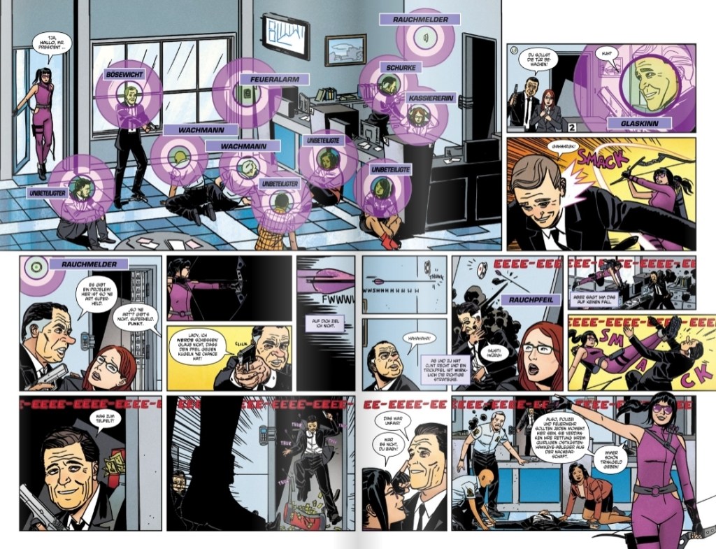 Optisch knüpft die Serie an das Design von Hawkeye von Fraction und Aja an, bringt aber auch eigene Stilelemente mit, die das Gesamtbild deutlich auffrischen. Dennoch bleibt die vorherrschende Farbe auch hier wieder einmal das Violett der Hawkeye-Kostüme in den verschiedensten Nuancen.
