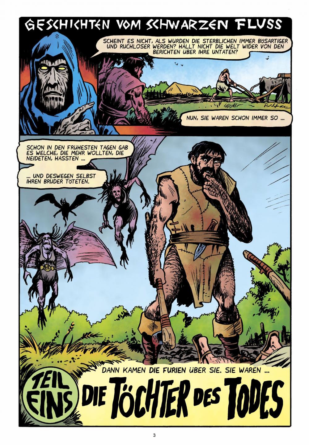 Im Grunde genommen kann man überhaupt nichts falsch machen mit einer neuen Horror Schocker Ausgabe. Selbstverständlich sind die Geschmäcker unterschiedlich, doch meiner Meinung nach enthält jede Ausgabe gute Geschichten, die mich nicht nur hervorragend unterhalten, sondern auch zeichnerisch begeistern. Der Verlag nimmt sich auch nicht zu ernst und serviert dem Leser seine zeichnerischen Eskapaden im freudigen Vorwort und redaktionellem Nachwort. Das macht die gesamte Heftgestaltung äußerst sympathisch! So gibt es in dieser Ausgabe jedoch kein Vorwort, es geht umgehend los mit der ersten besonderen Geschichte in drei Akten. Sie erzählt eine Geschichte aus der Welt des Fährmanns Charon. Seine Aufgabe ist es, die Seelen der Verstorbenen über den Fluss Styx in die Unterwelt zu geleiten.