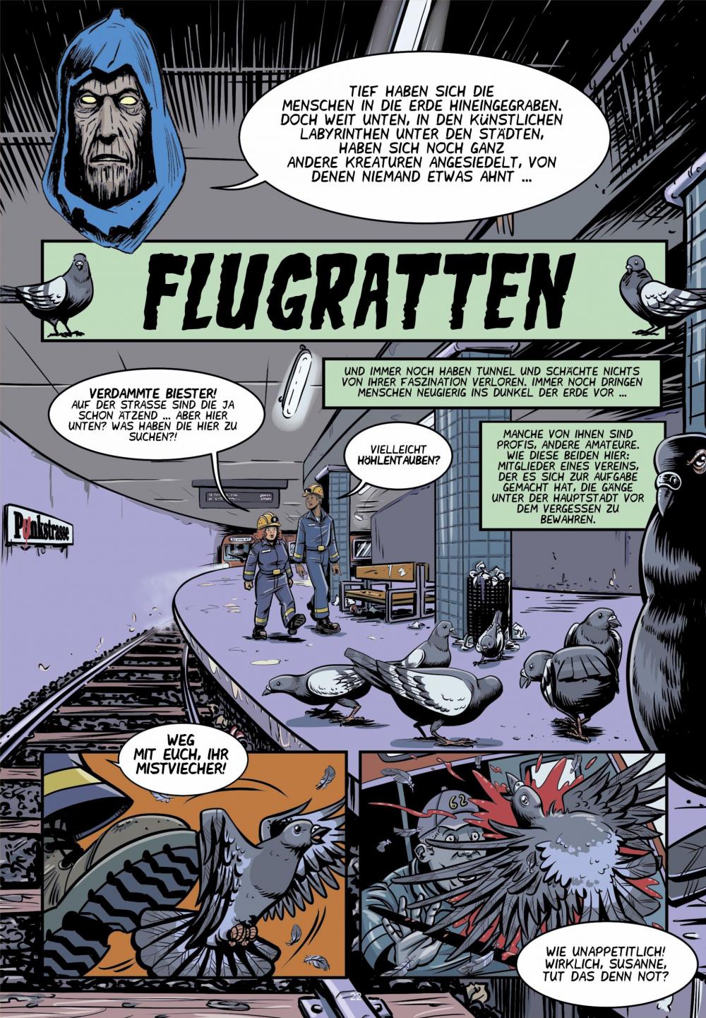 Flugratten ist dann auch direkt die nächste Geschichte, welche ebenfalls interessant erzählt wird. Zugleich etwas düsterer in den dunklen Gängen verlassener U-Bahnhöfe gibt es viele unheimliche Gänge. Wie der Titel schon beschreibt, können die dort lebenden Tiere scheinbar fliegen und sind gefährlich …