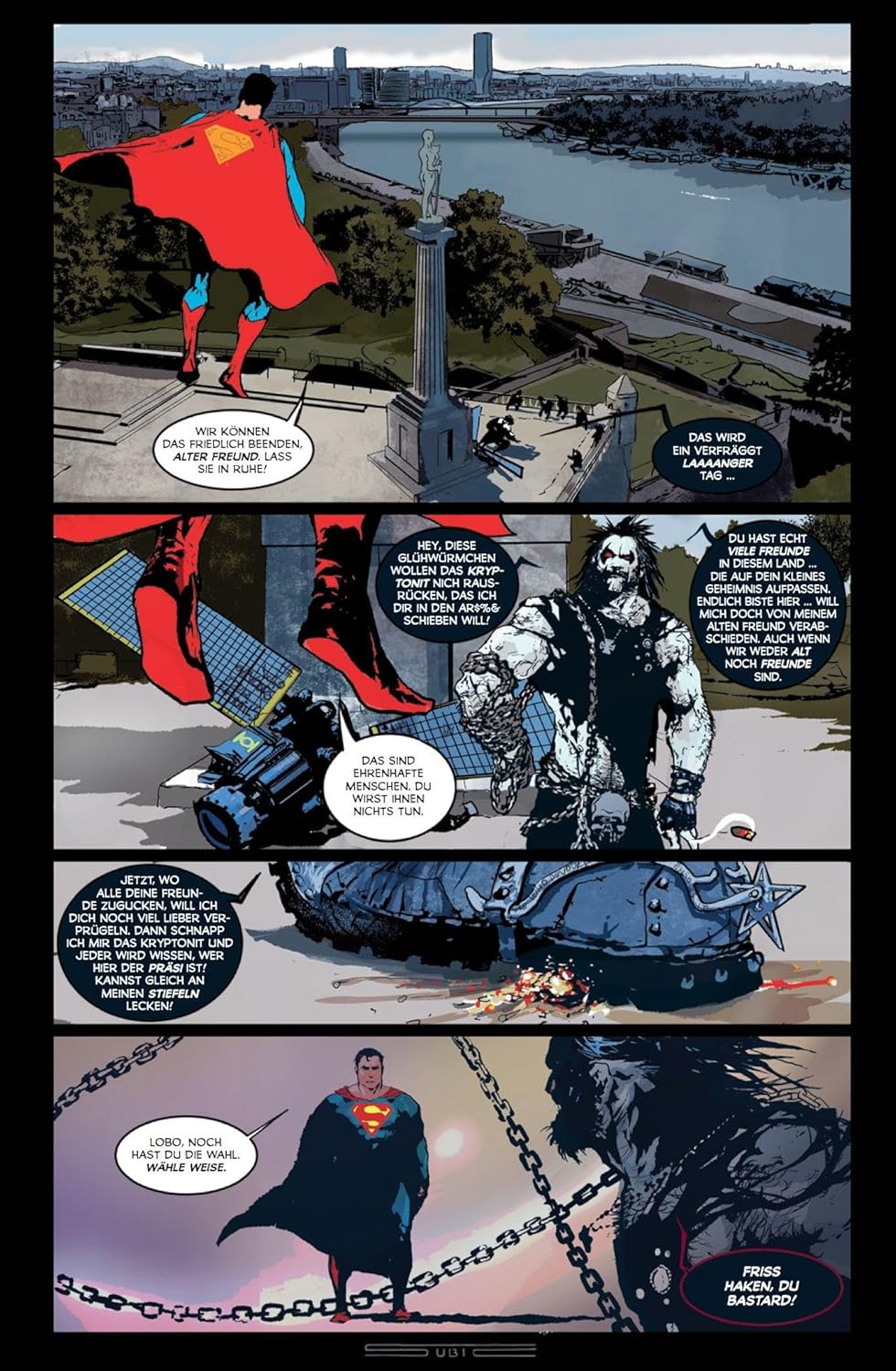 Bereits die erste Geschichte aus Amerika hat mich überzeugt. Superman kämpft gegen ein riesiges Monster aus dem All, welches auf der Erde mit dem Raumschiff eine Notlandung hinlegen musste. Die Menschen feuern mit allen Waffen, doch das angebliche Alien entpuppt sich in keiner Weise als Feind. Diese Geschichte beinhaltet eine emotionale Botschaft, die beinahe zu einer Katastrophe geworden wäre. Die spanische Geschichte überzeugt mich ebenfalls konsequent und zeichnet mir ein Lächeln ins Gesicht. Superman verweilt für eine geraume Zeit in Andalusien (Granada) ohne Kräfte und hat dabei eine interessante Zeit. Eine weitere Geschichte erzählt von Dantes Inferno, ein episches Gedicht aus Italien. So unterschiedlich die Geschichten auch sind, die Zeichnungen und die Farben unterscheiden sich ebenfalls wie die Länder, Zeichner und Autoren. Selbst Lobo muss sich in einer Geschichte aus Serbien mit Superman auseinandersetzen. In der Geschichte aus Kamerun ist Lois Lane nicht nur äußerst attraktiv anzusehen, Superman muss sich sogar mit einem Gott bekämpfen und Batman schaut zu … Schwarz-weiße Zeichnungen mit der besonderen Farbe Blau befassen sich mit der indischen Thematik ein Held zu sein. Selbst das Grün und deren Elementare spielen in einer Geschichte eine herausragende Rolle. In der Türkei hat Superman in Istanbul alle Hände voll zu tun und in Frankreich in Paris kann er sich vorerst etwas erholen …