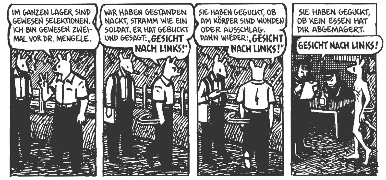 Spiegelman scheut sich nicht die Greueltaten unverfälscht, so wie sie sein Vater erlebt hat, wiederzugeben. Er nutzt dafür die Tierwelt um seine Personen zu charakterisieren.